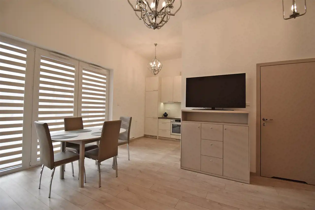 - przestronny salon z aneksem kuchennym,