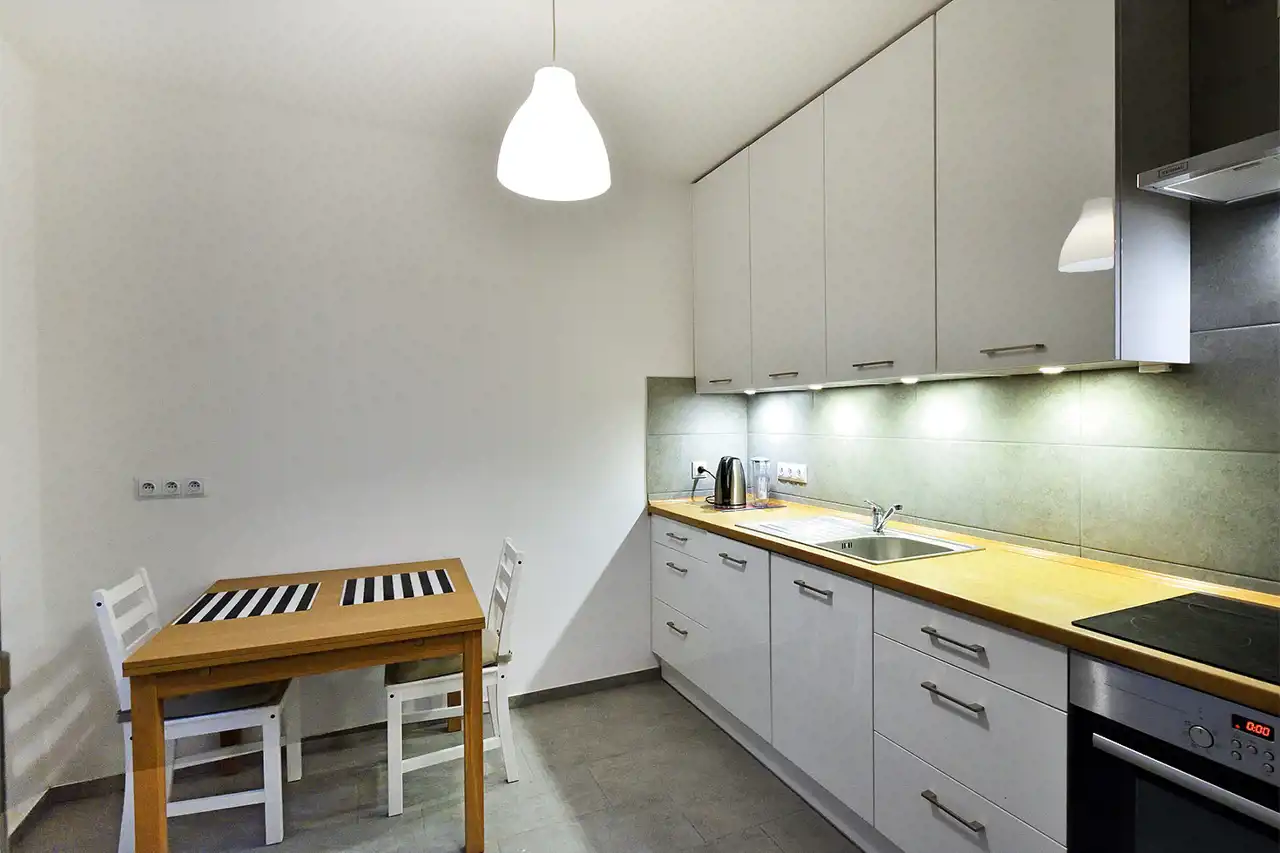 W sypialni znajduje się pojemna szafa w zabudowie. W kuchni wszystkie niezbędne sprzęty (kuchenka indukcyjna, lodówko-zamrażarka, zmywarka, okap), w łazience pralka.