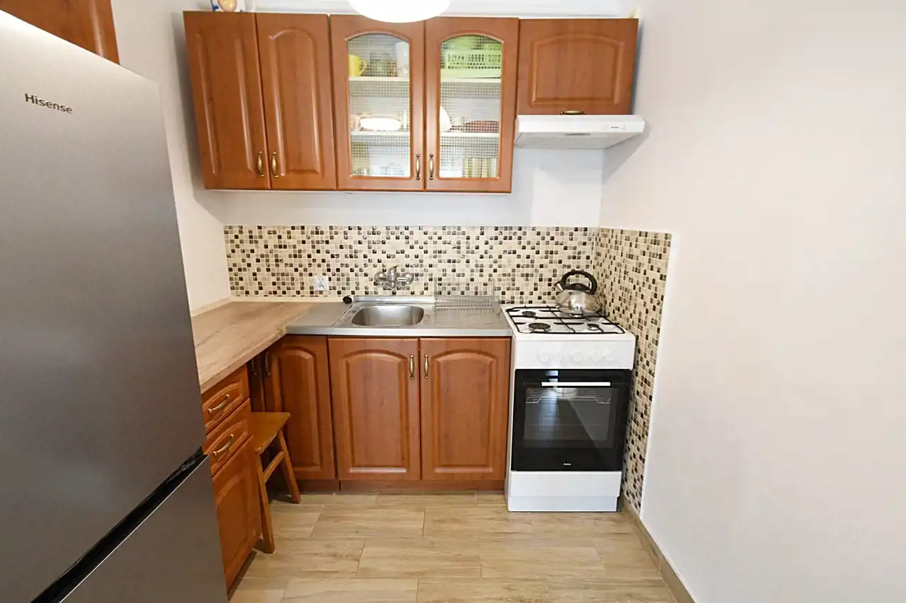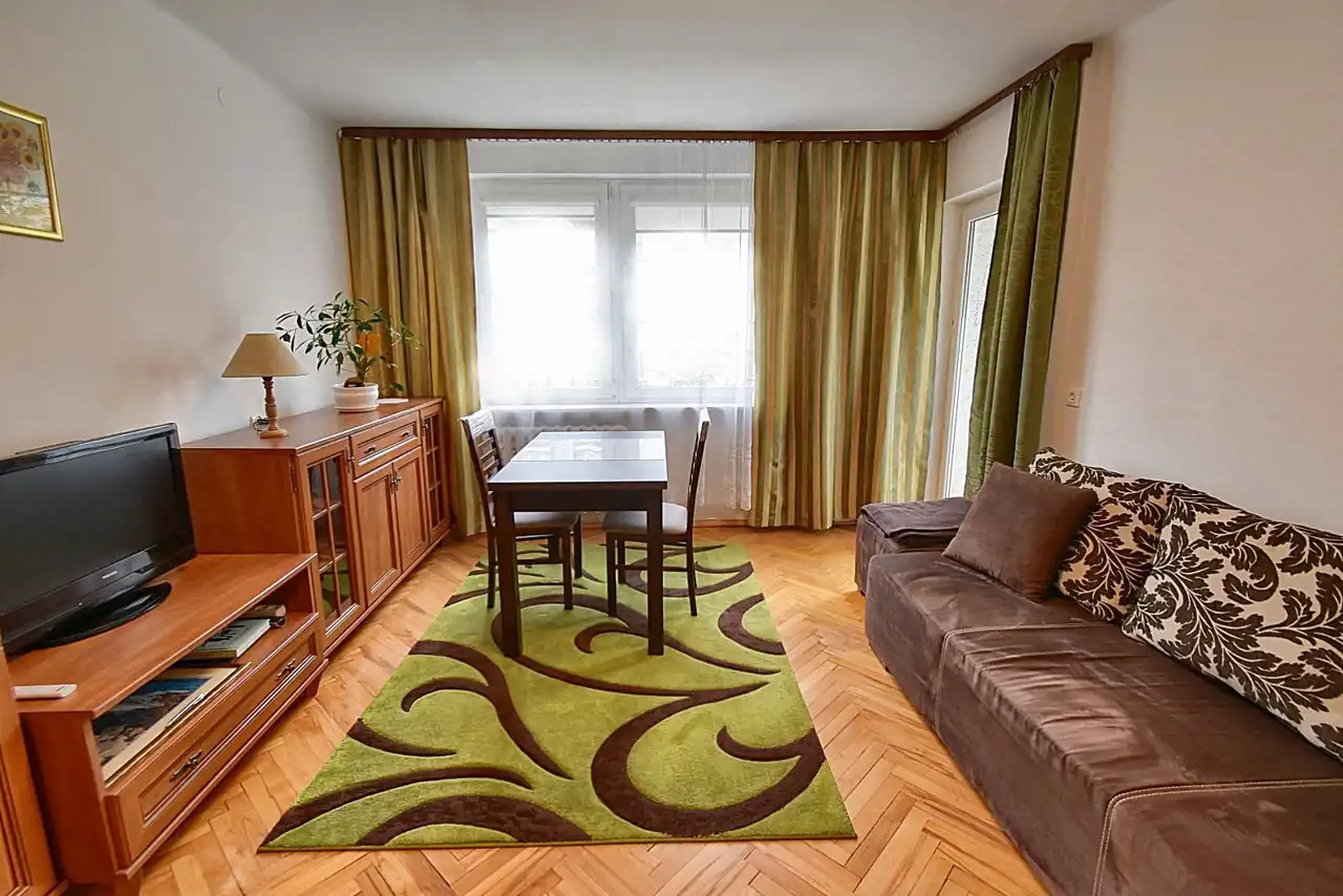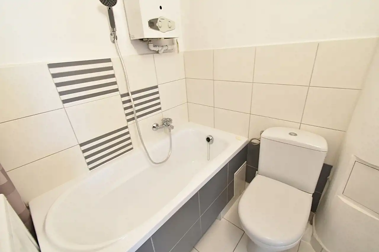 Single-aspect, bright apartment. PVC windows. Parquet flooring in the living room; panels in the bedroom; terracotta tiles in the bathroom and kitchen. Heating from the district network, hot water from a gas water heater.