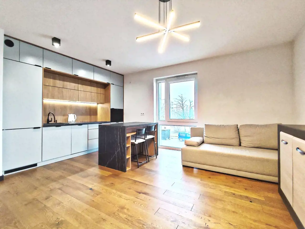 - dużego salonu z nowoczesnym aneksem kuchennym i wyjściem na balkon