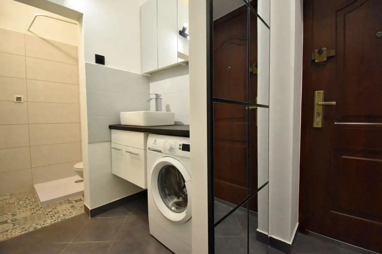 Rent: 2100 PLN + administrative fee 130 PLN (includes cold water, waste disposal, common areas) + electricity and gas according to meter readings. One-month deposit required.