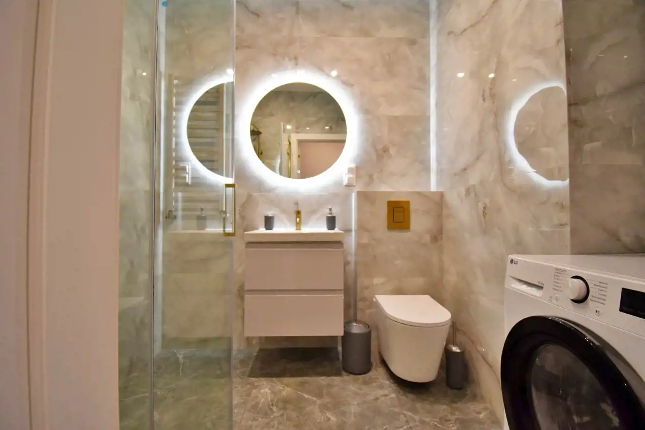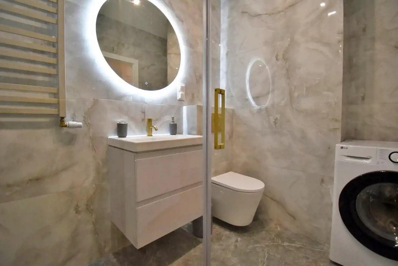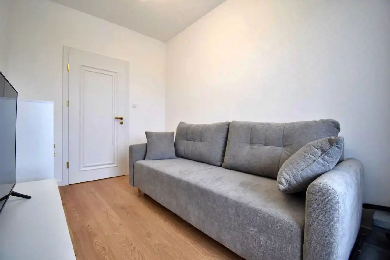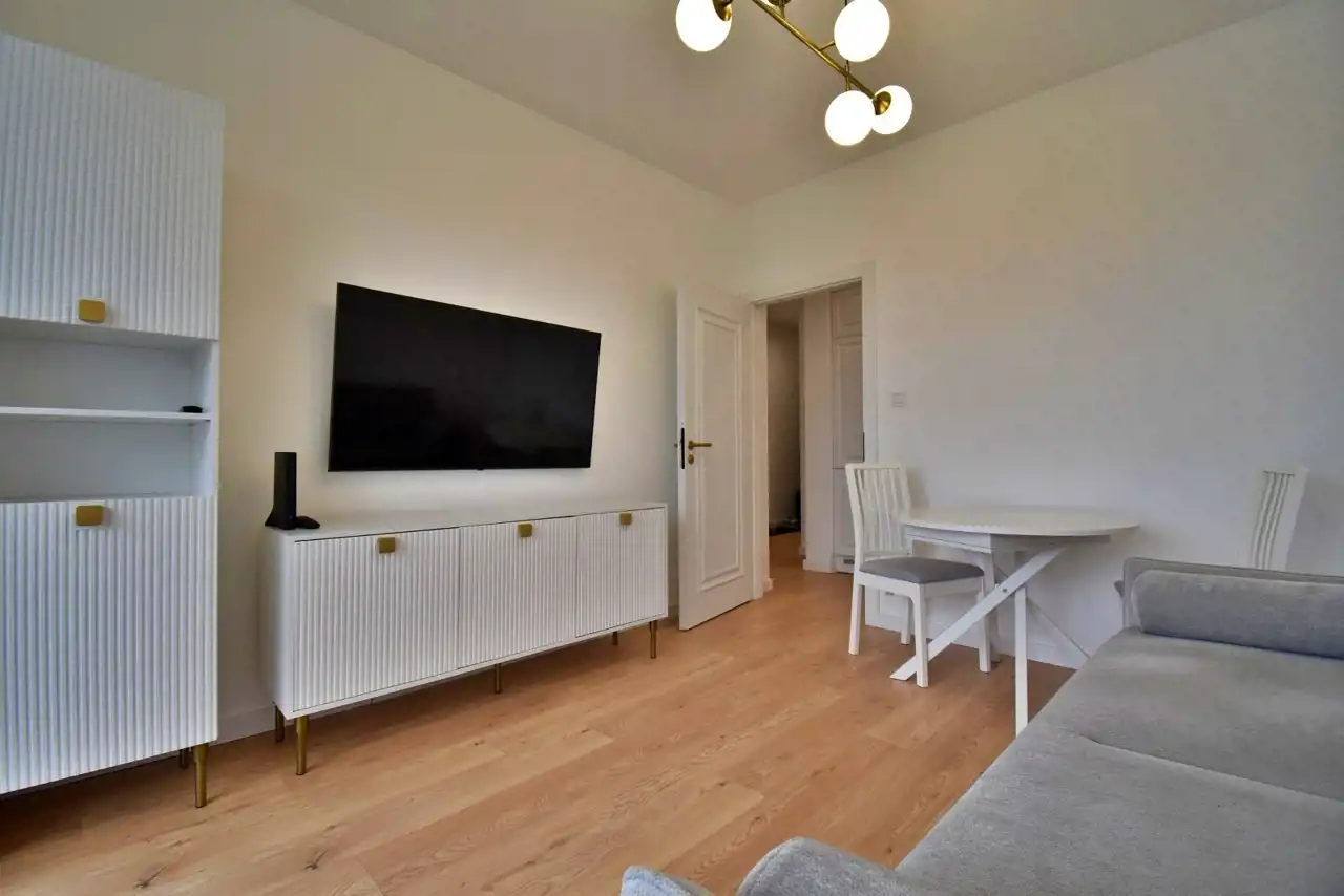 Mieszkanie w pełni umeblowane, urządzone przy użyciu wysokiej jakości materiałów, wyposażone w sprzęt AGD i RTV (m.in. lodówka, piekarnik, płyta indukcyjna, dwa telewizory, pralko - suszarka).