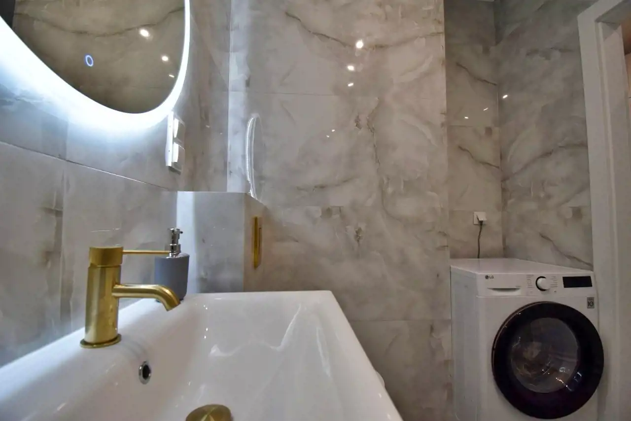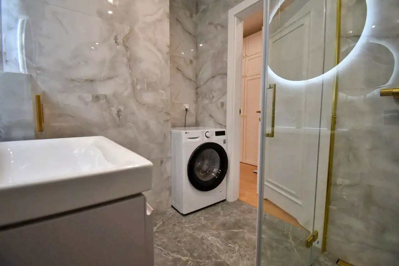 The apartment is fully furnished, finished with high-quality materials, and equipped with household appliances and electronics (including a fridge, oven, induction hob, two TVs, and a washer-dryer).