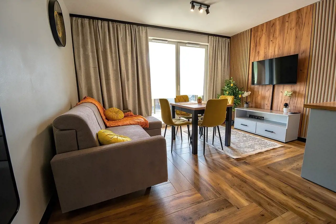 For rent: a modern, fully furnished and equipped apartment with an area of 42.87 m², located on the 1st floor of a low-rise, 4-storey apartment building at Okrzei Street – in the very center of the city.