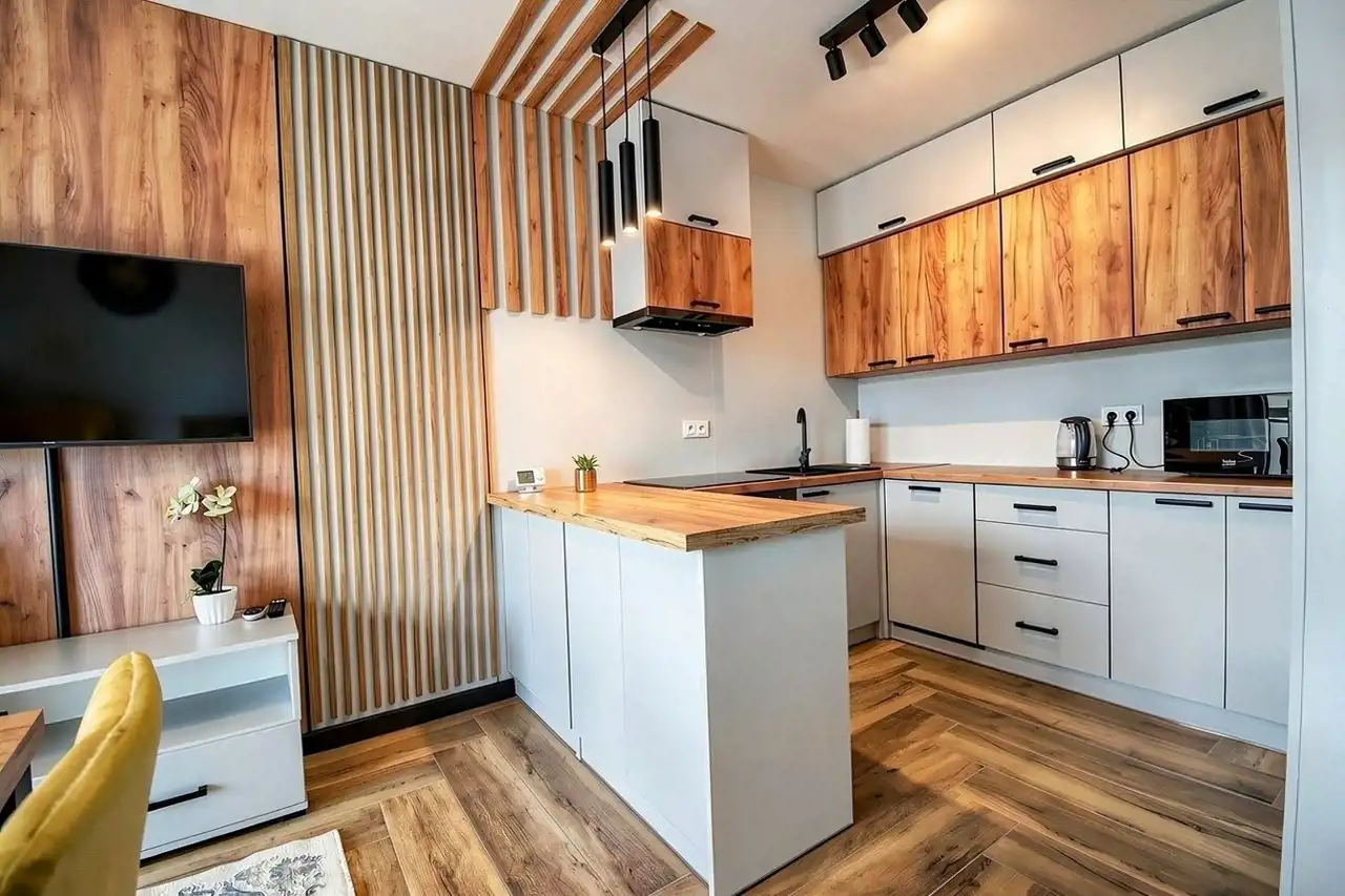 - przestronny salon z aneksem kuchennym,