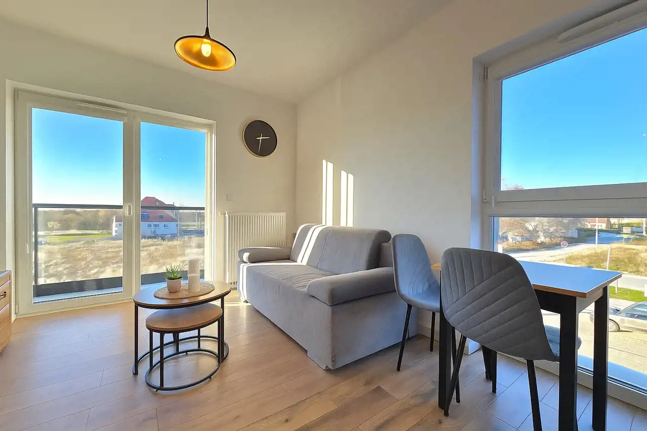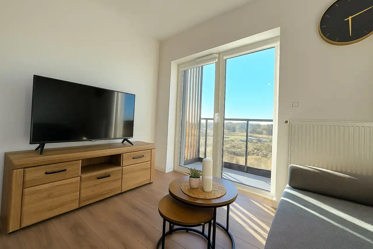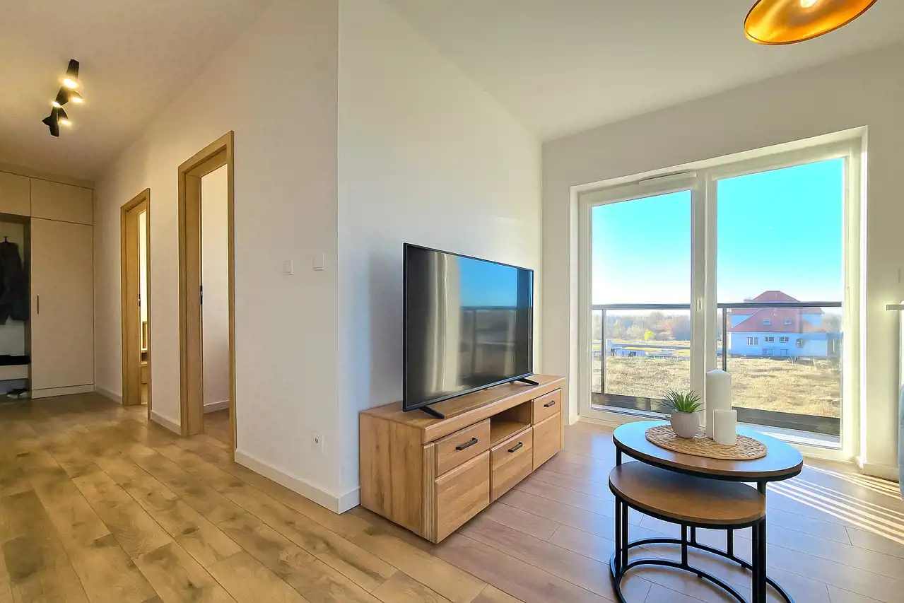 - przestronnego, jasnego salonu z wyjściem na słoneczny balkon