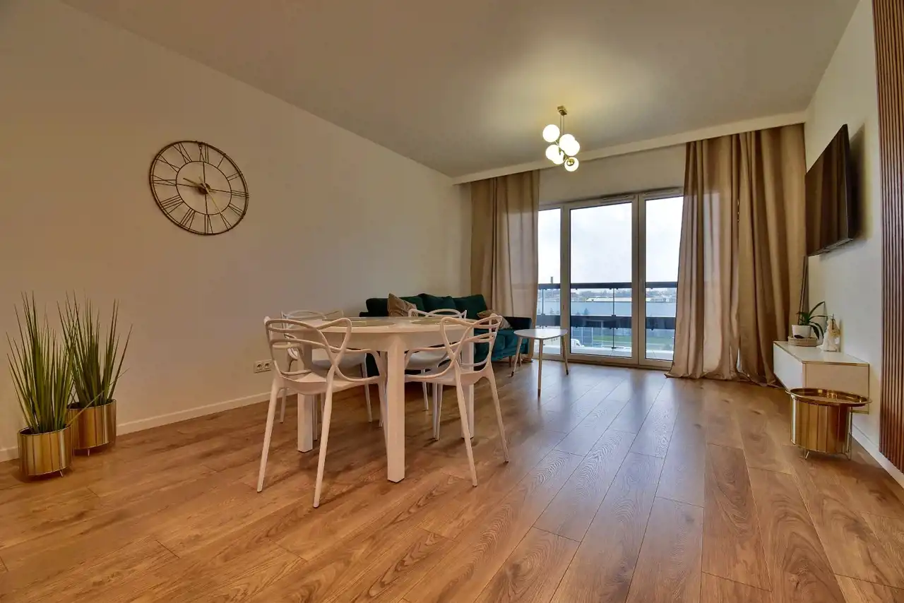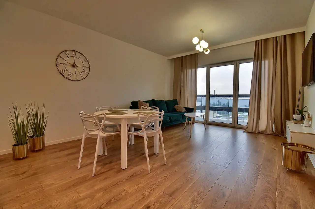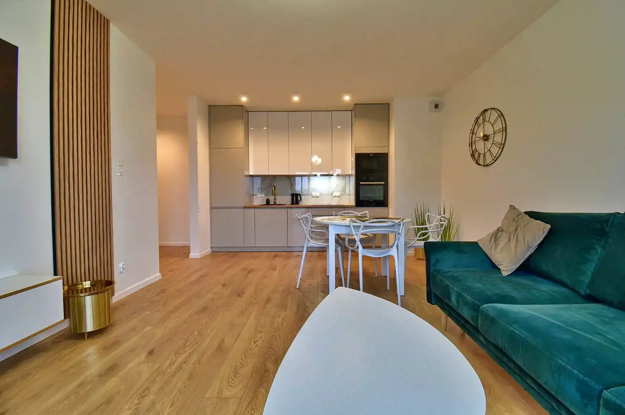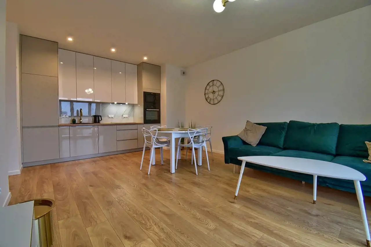 - przestronny salon połączony z aneksem kuchennym, wyposażony w sprzęt AGD (lodówko-zamrażarka, zmywarka, kuchenka indukcyjna, mikrofalówka w zabudowie), w salonie kanapa, stół z krzesłami.