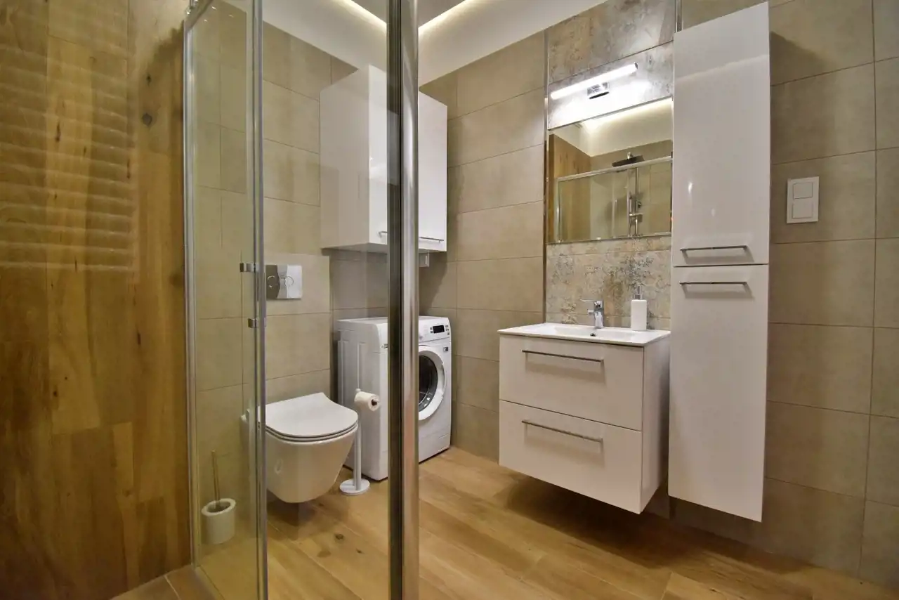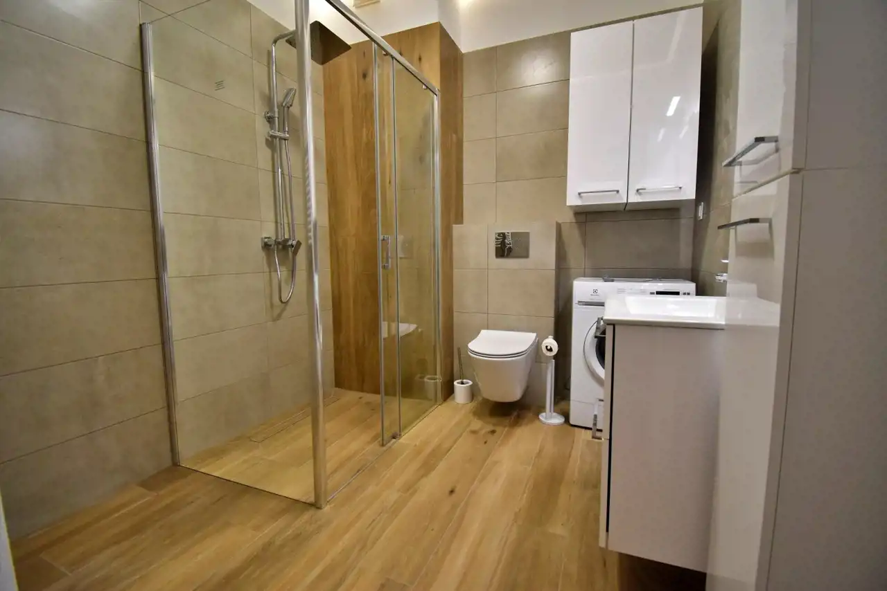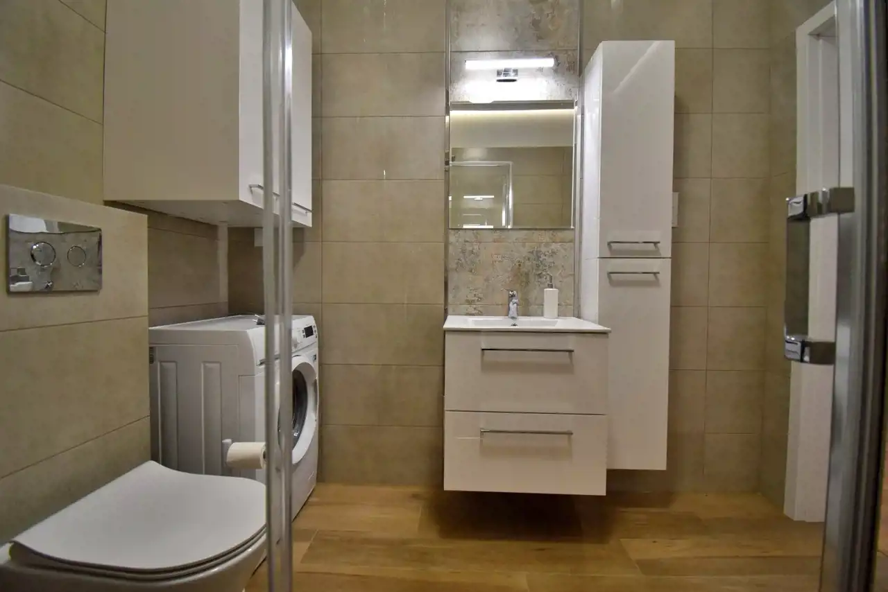The apartment is located in a new building with a view of green areas, and at the same time very well connected to the rest of the city. Nearby: bus stops, shops, offices, park.