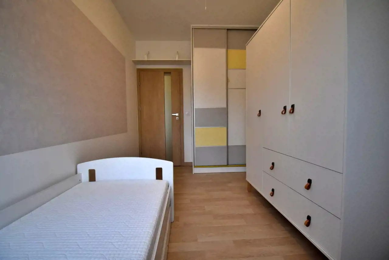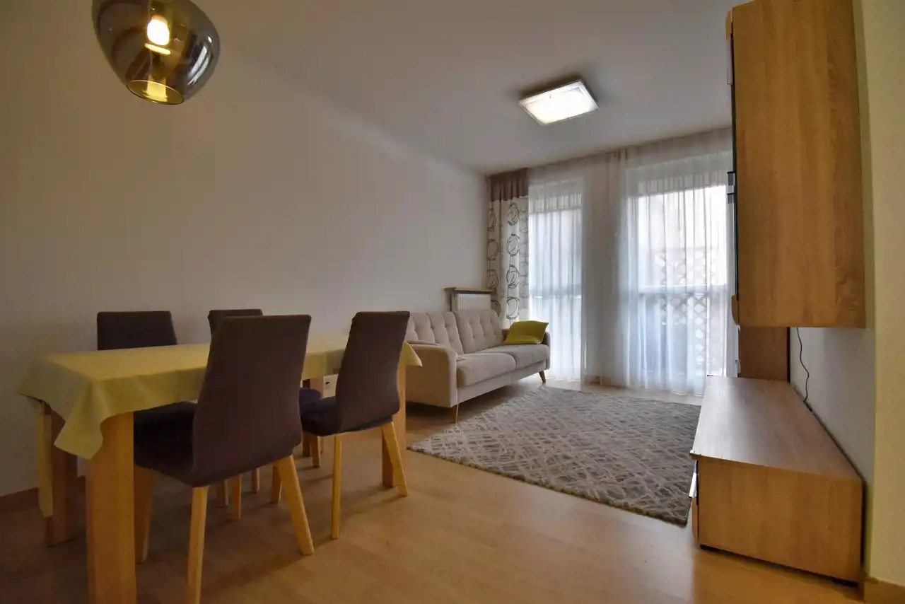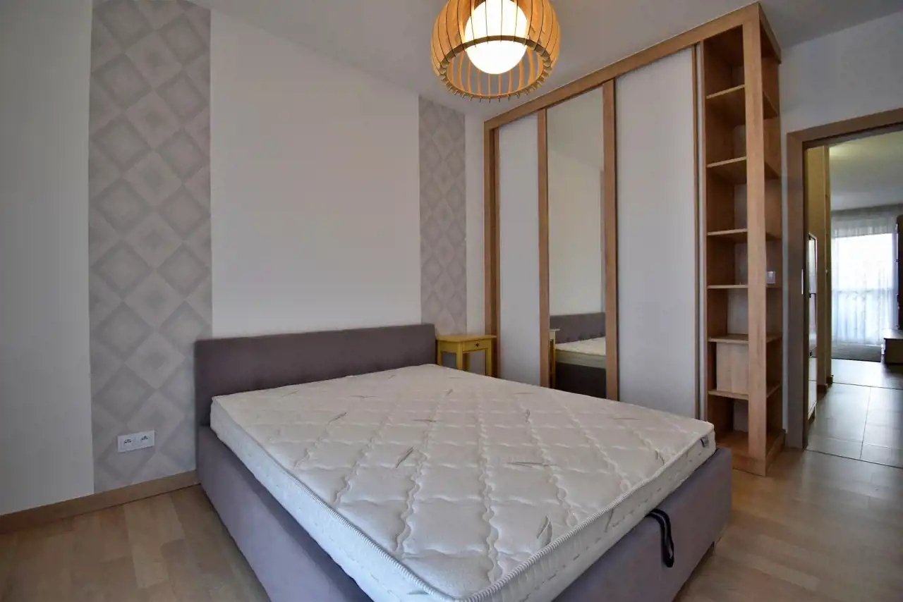 Mieszkanie wykończone w wysokim standardzie, w pełni umeblowane i wyposażone w niezbędne sprzęty AGD m.in. suszarka, zmywarka, mikrofalówka w zabudowie, piekarnik, płyta indukcyjna, lodówka w zabudowie, ekspres do kawy, telewizor, odkurzacz, żelazko, deska do prasowania). W mieszkaniu w salonie zamontowana klimatyzacja. W każdym oknie w mieszkaniu zamontowane moskitiery.