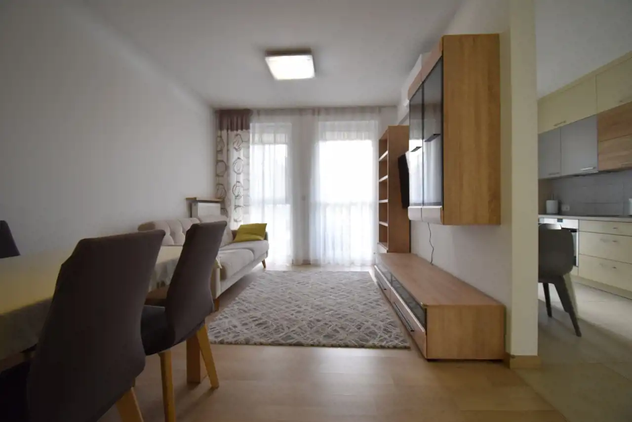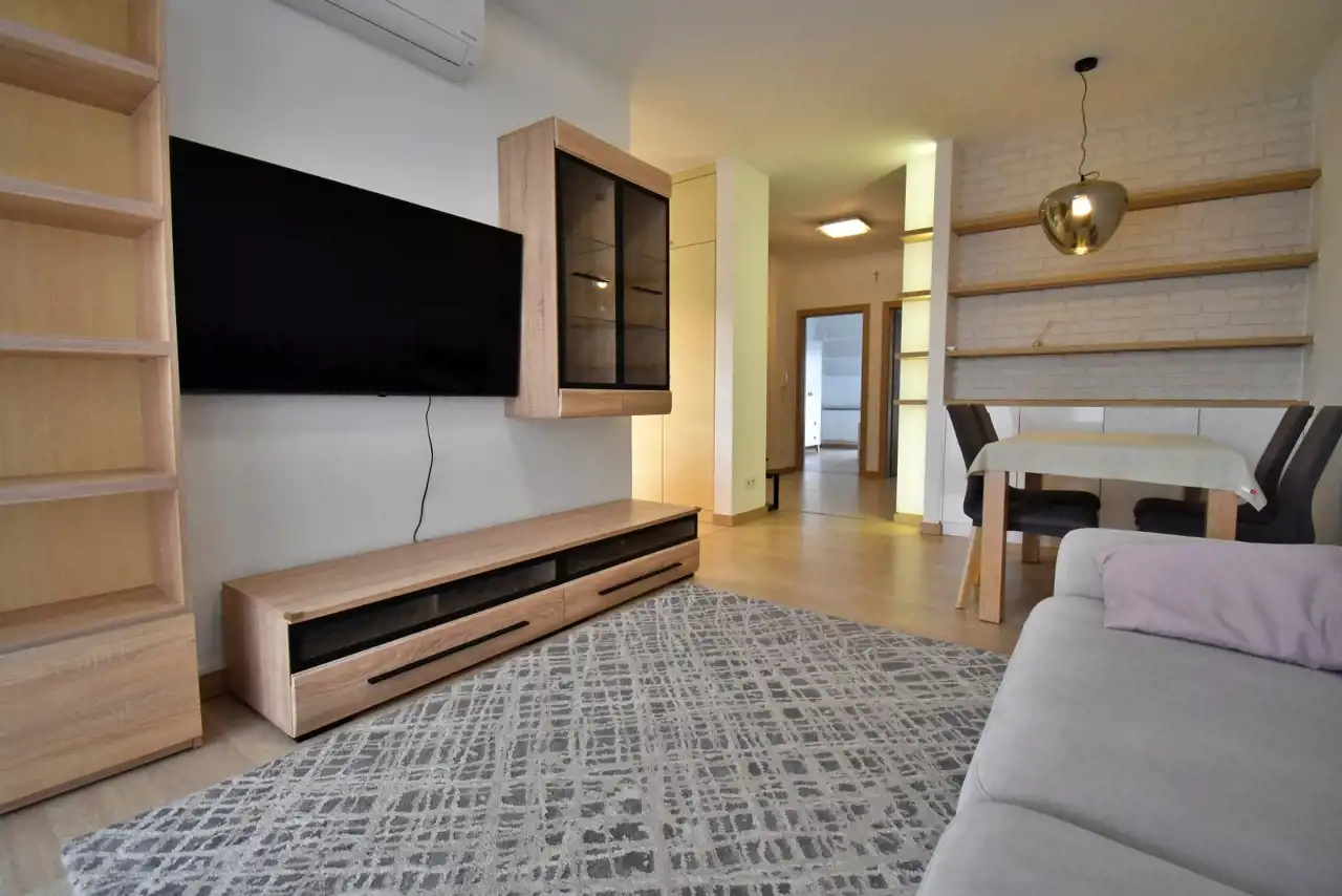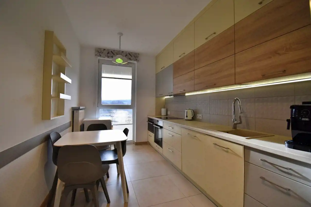 The apartment is located in a modern building with a view of green areas (Telegraf Hill), while at the same time being very well connected with the rest of the city. Nearby there are bus stops, shops, offices, a park, and a school.