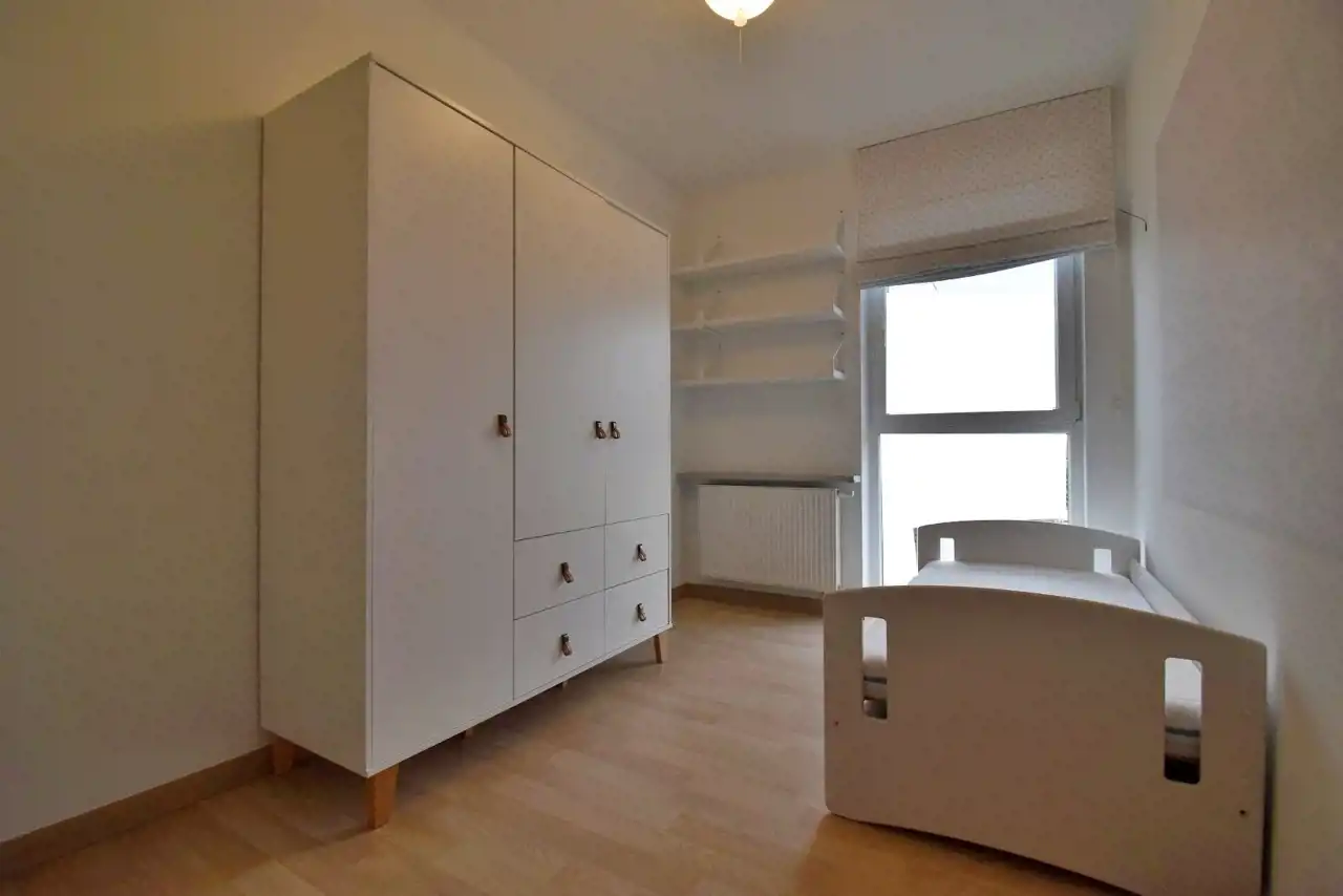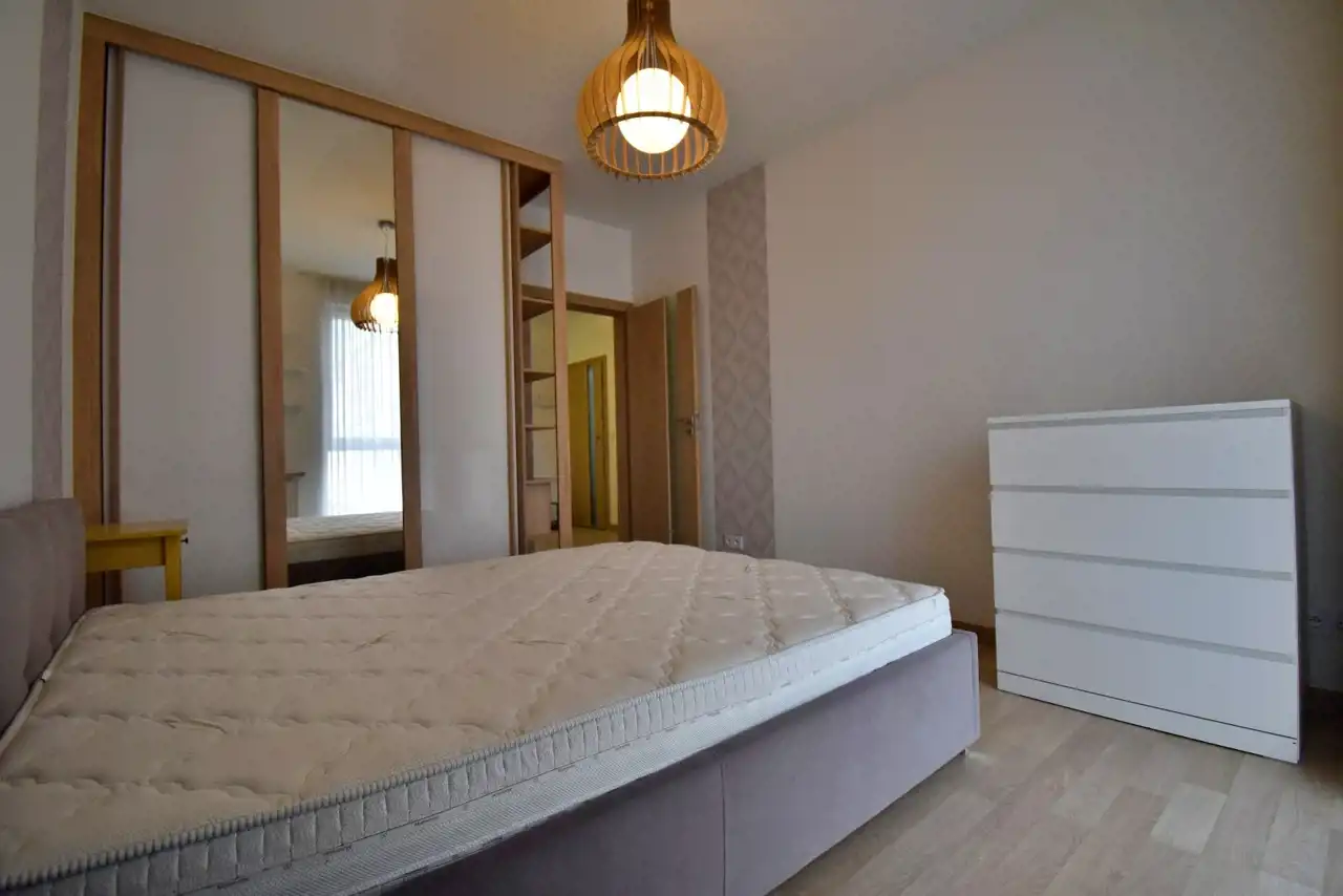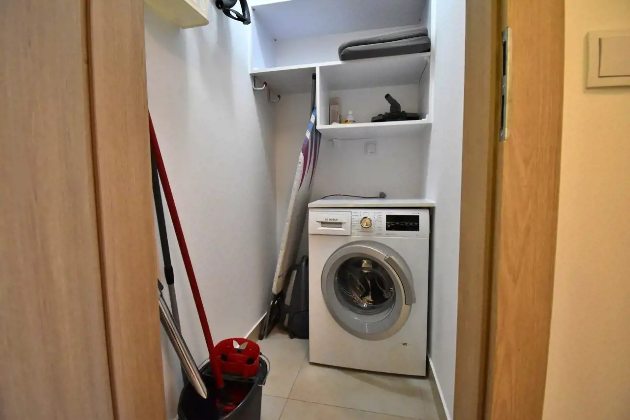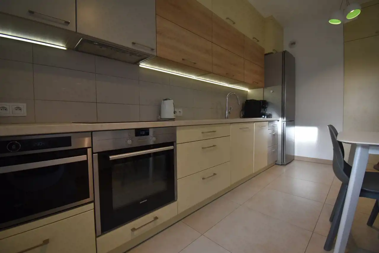 The apartment is finished to a high standard, fully furnished and equipped with necessary household appliances, including a dryer, dishwasher, built-in microwave, oven, induction hob, built-in fridge, coffee machine, TV, vacuum cleaner, iron, and ironing board. The living room is equipped with air conditioning. Mosquito nets are installed in all windows.