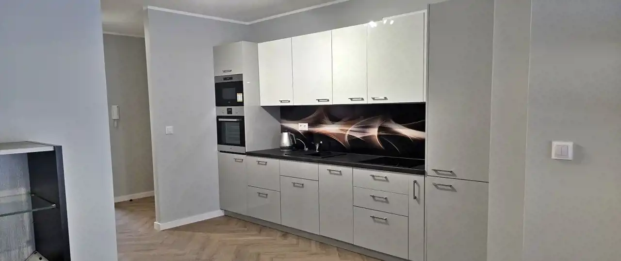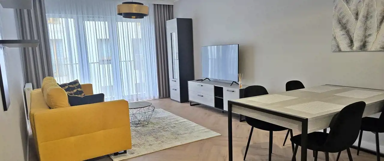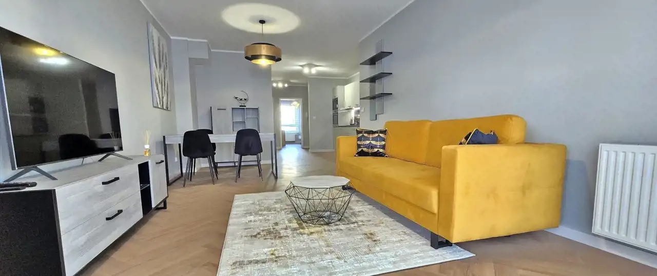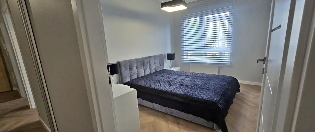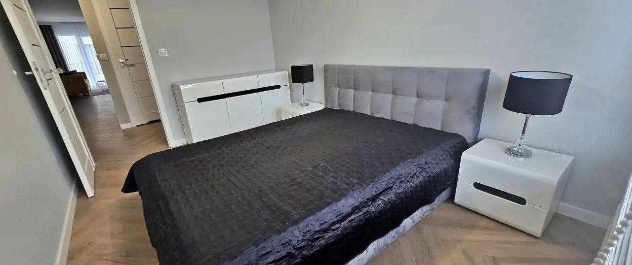Mieszkanie umeblowane, wykończone przy użyciu wysokiej jakości materiałów, w pełni wyposażone (m.in pralka, lodówka, zmywarka kuchenka elektryczna, kanapa, łóżko).