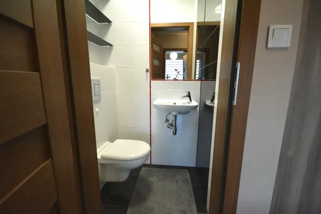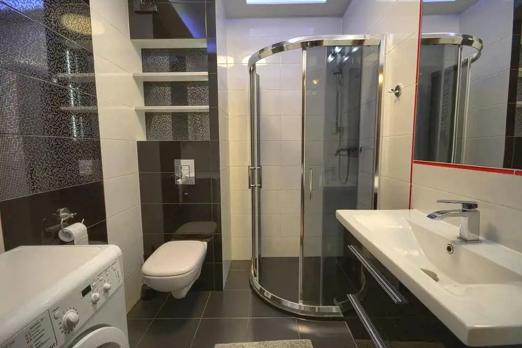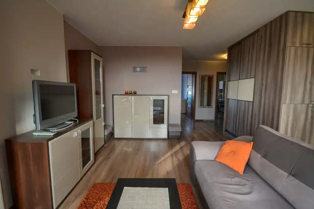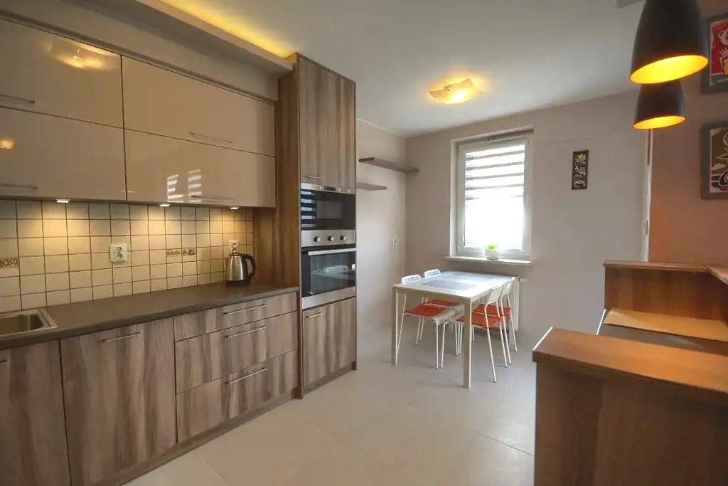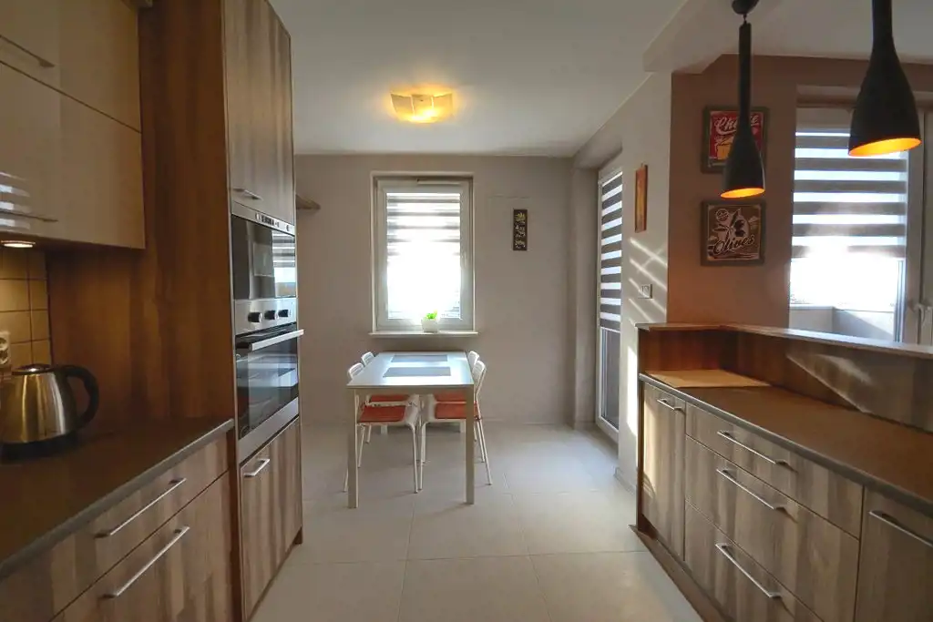 The apartment is bright and corner-positioned, with windows facing two directions: north and south. Triple-glazed PVC windows. Floor finishes: laminate flooring in the rooms, and tiles (gres) in the kitchen, bathrooms and hallway. Heating and hot water are supplied from the municipal network (no gas water heaters in the building).