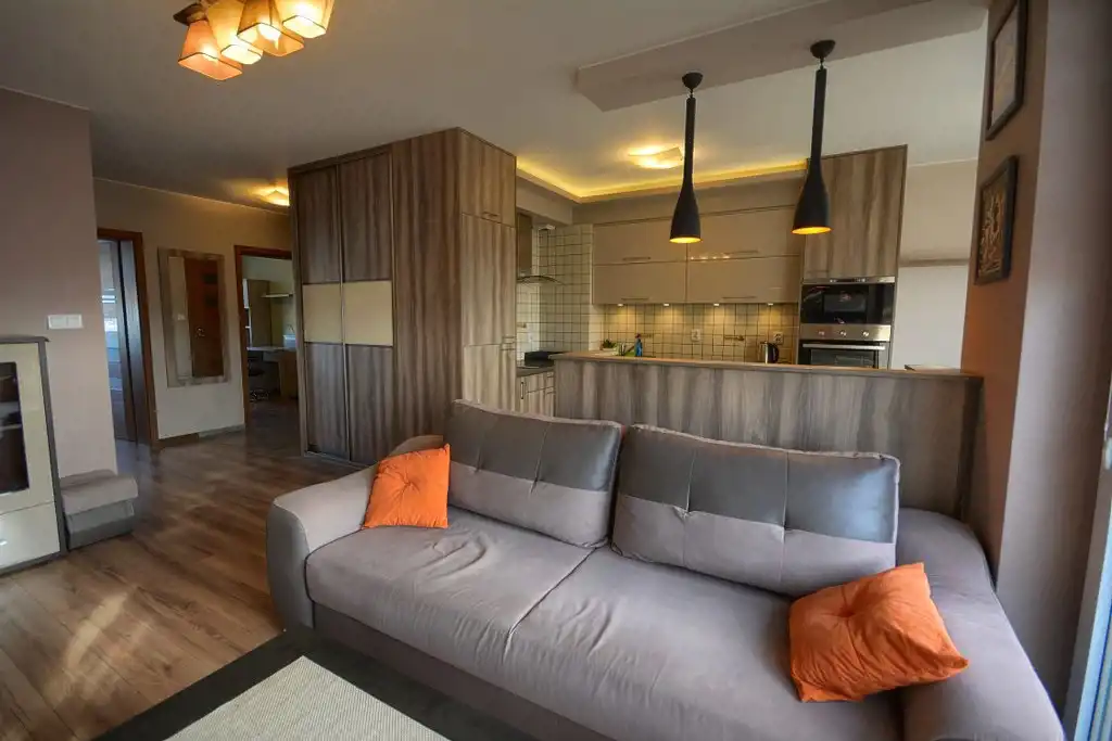 Mieszkanie w pełni umeblowane, nowocześnie wykończone z użyciem wysokiej jakości materiałów (w kuchni zabudowa kuchenna- lodówko/ zamrażarka, zmywarka, płyta indukcyjna, piekarnik, mikrofalówka do zabudowy).