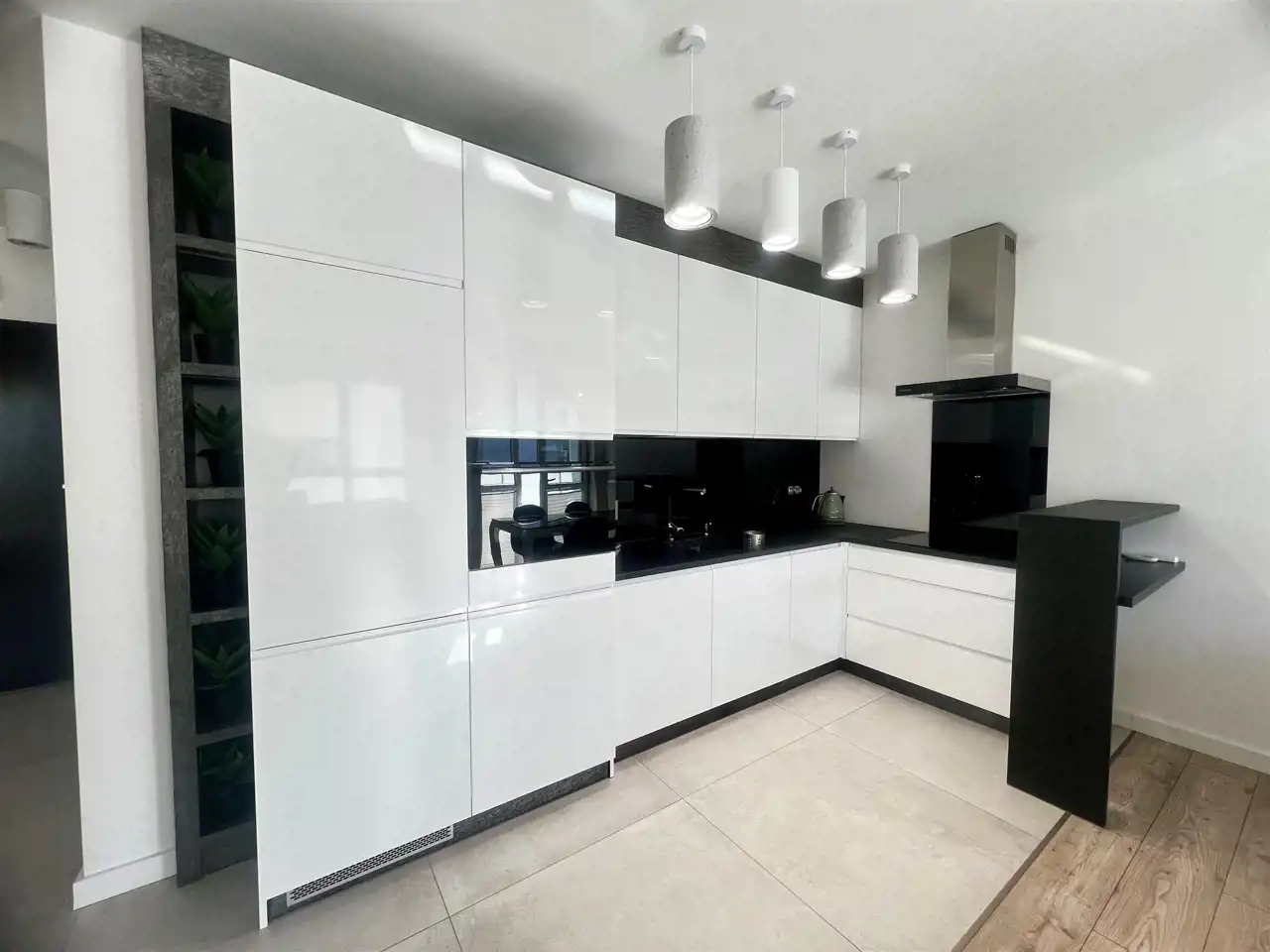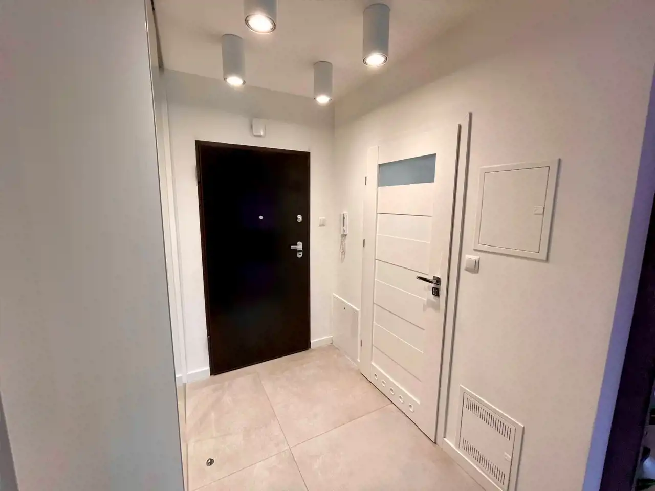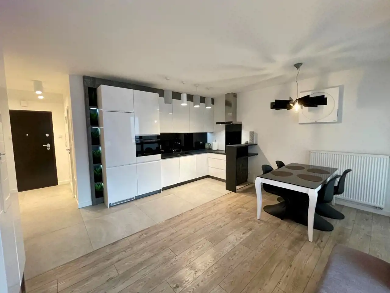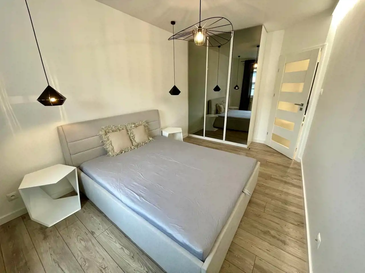 Wnętrze apartamentu to połączenie elegancji i funkcjonalności – jasne, przestronne pokoje, w pełni wyposażona kuchnia, stylowa łazienka oraz komfortowa sypialnia.