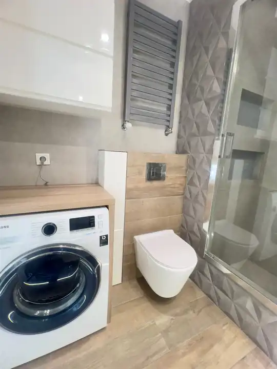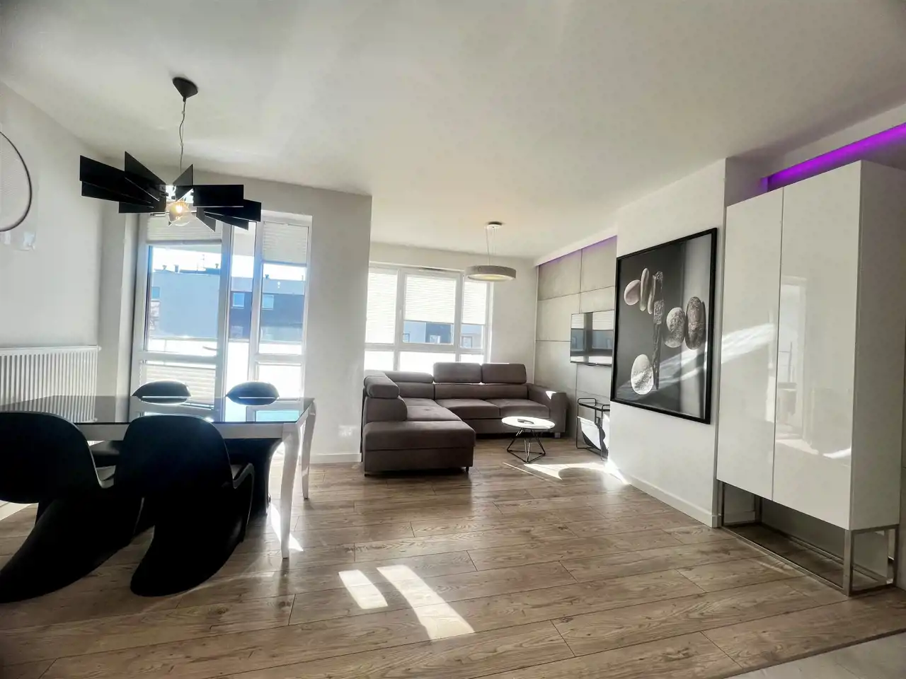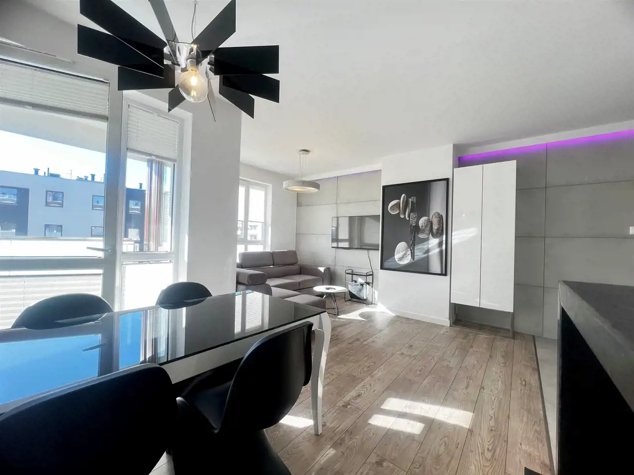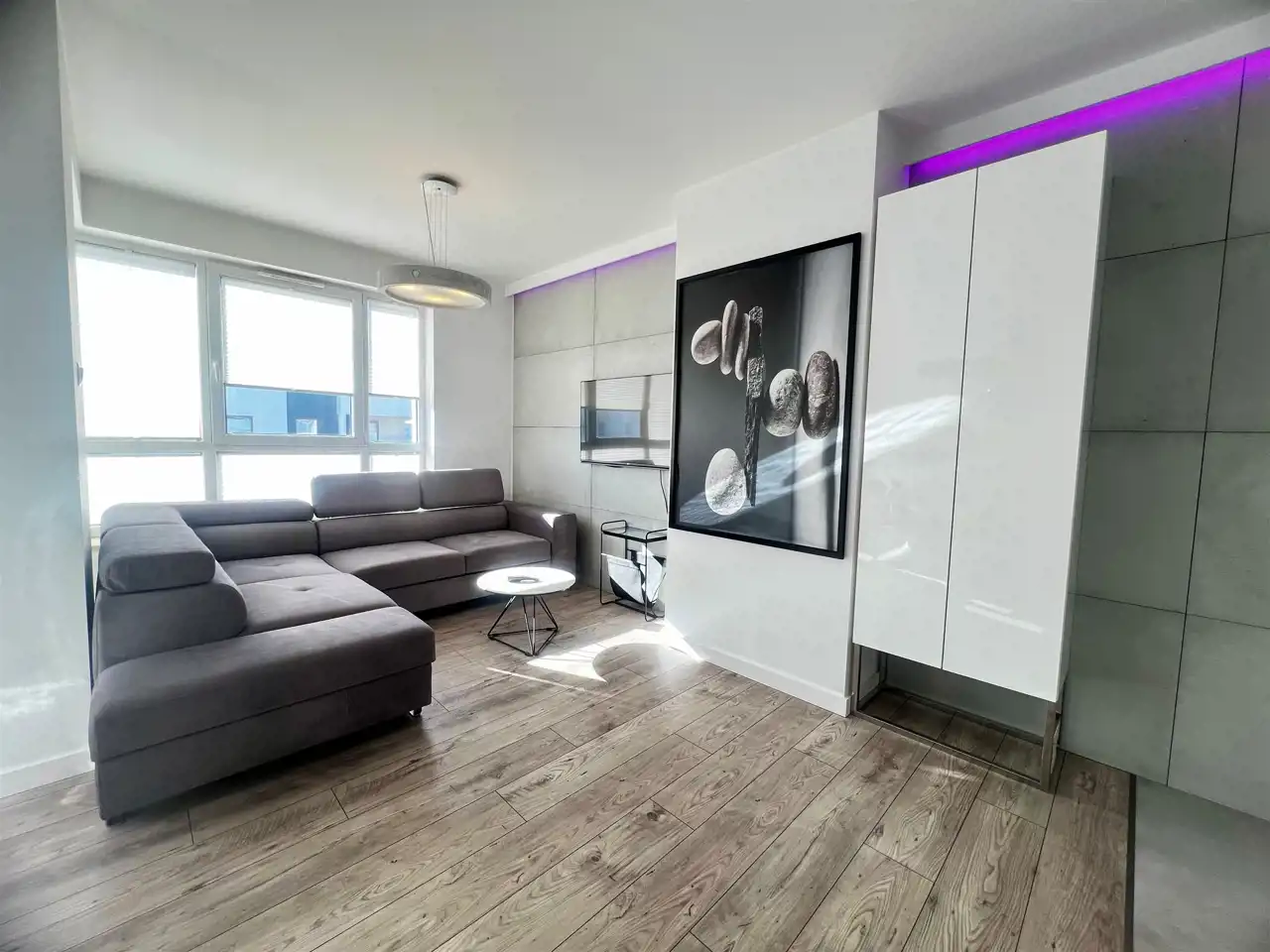 Wnętrze apartamentu to połączenie elegancji i funkcjonalności – jasne, przestronne pokoje, w pełni wyposażona kuchnia, stylowa łazienka oraz komfortowa sypialnia.