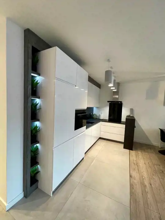 ANEKS KUCHENNY - widny z oknem, meble na wymiar, wyposażone w sprzęt AGD: zmywarka, okap, płyta indukcyjna, piekarnik, lodówko-zamrażalka, czajnik, garnki.