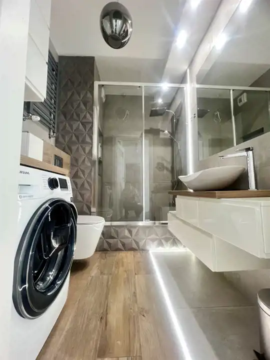 ŁAZIENKA - wyposażona w kabinę prysznicową, umywalkę, lustro, wc, pralkę.
