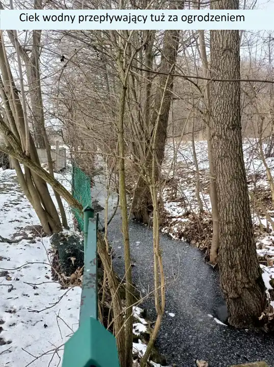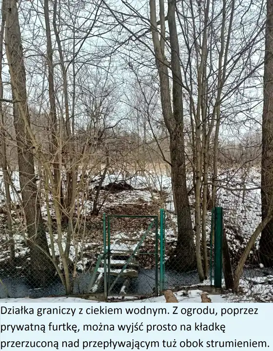 Po przeciwnej stronie, "od tyłu", działka graniczy bezpośrednio z ciekiem wodnym. Z ogrodu, poprzez prywatną furtkę, można wyjść prosto na kładkę przerzuconą nad przepływającym tuż obok strumieniem.