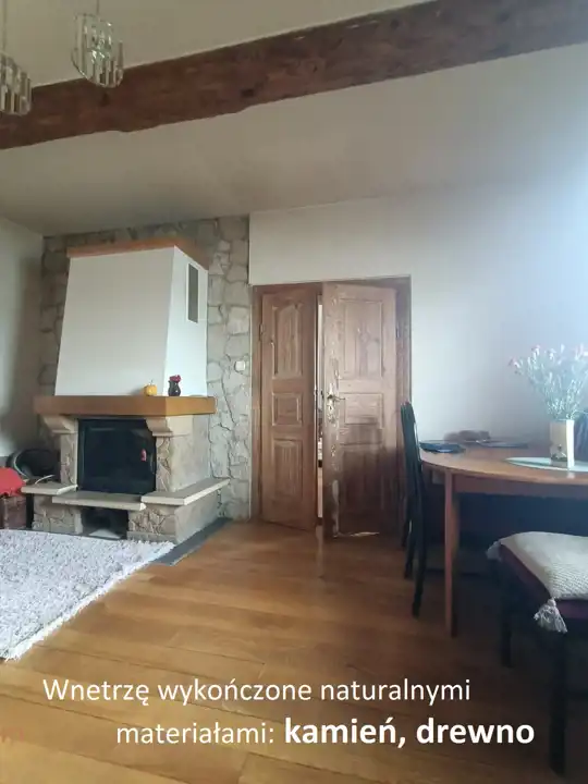 Przytulne wnętrze wykończone jest naturalnymi materiałami: podłogi drewniane z desek na legarach, widoczne drewniane belki stropowe, wokół kominka okładzina z kamienia naturalnego, co tworzy niepowtarzalna przestrzeń z duszą.