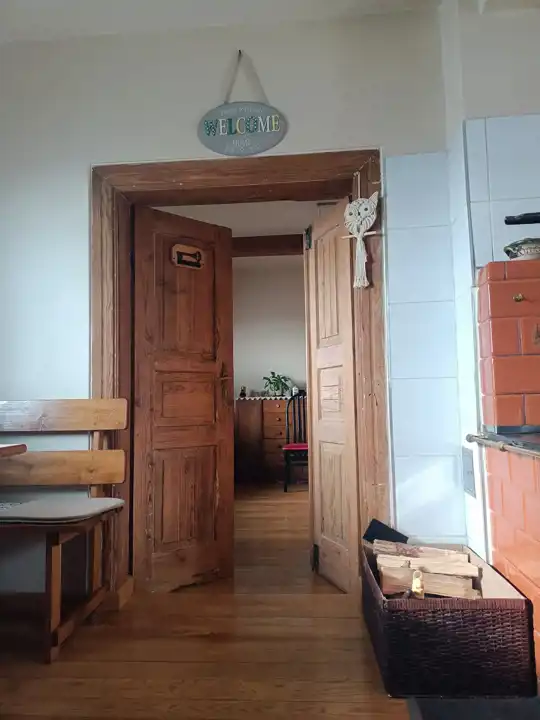 Sercem domu jest tradycyjna kuchnia kaflowa, która nie tylko ogrzewa, ale także nadaje wnętrzu wyjątkowego, sielskiego uroku. W chłodniejsze dni niezastąpiony będzie kominek, znajdujący sie w drugim pomieszczeniu (pokoju).