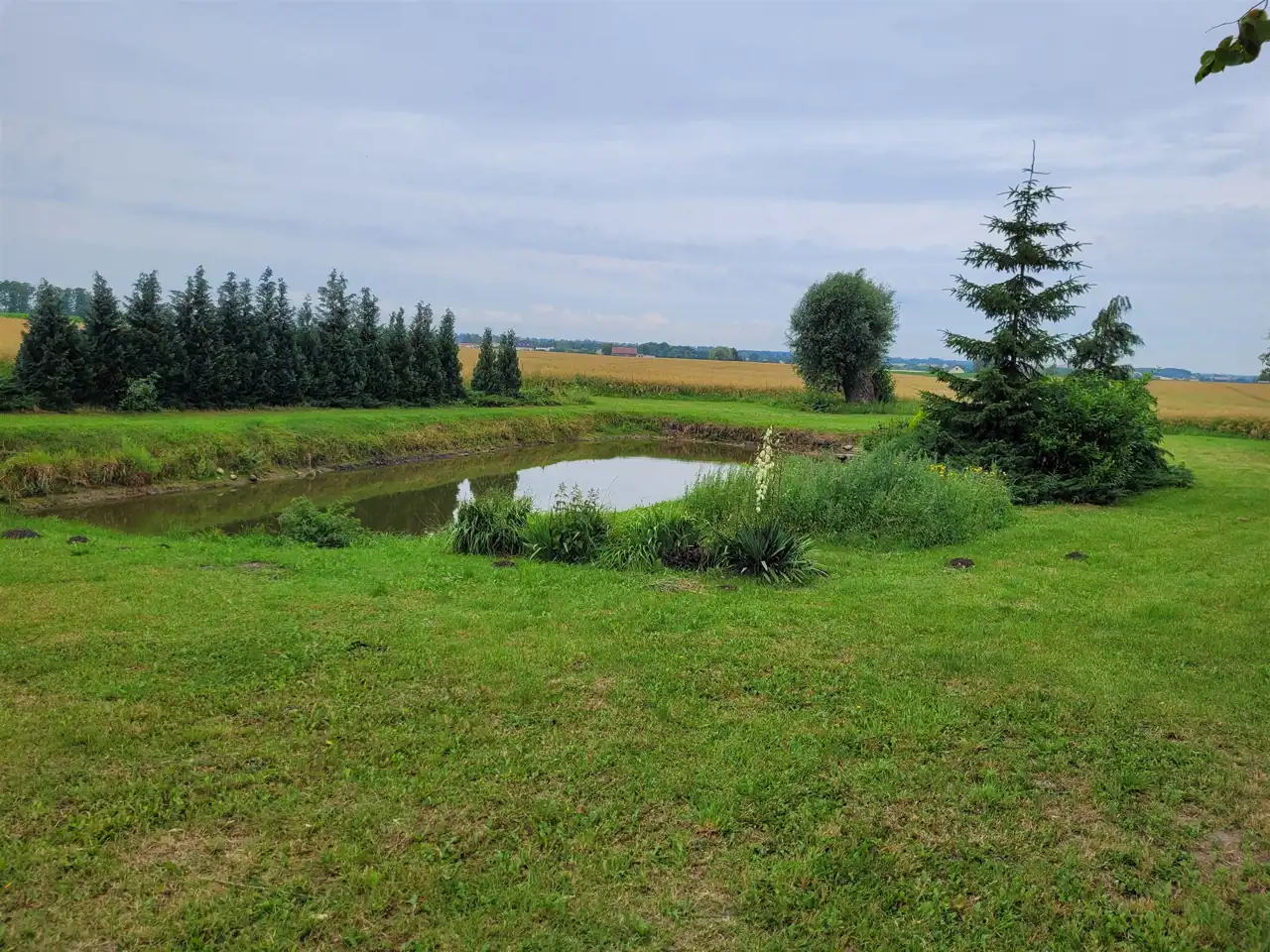 Duża działka o powierzchni około 96 arów, częściowo ogrodzona, pięknie zagospodarowana, wiele drzew owocowych oraz staw.