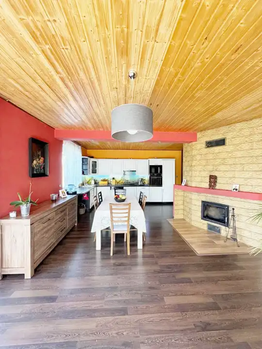 Ogrzewanie kominkowe z płaszczem wodnym, które rozprowadza ciepło do grzejników w salonie i sypialniach i do ogrzewania podłogowego w korytarzu i łazience.