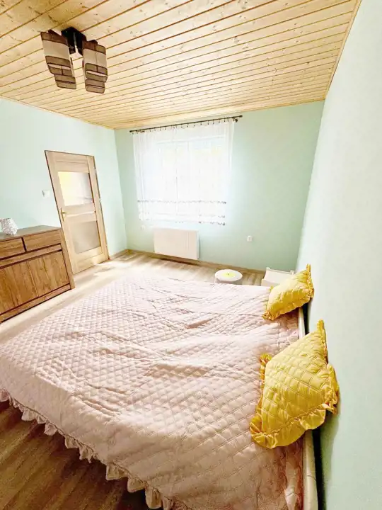We wszystkich trzech sypialniach na podłogach są panele, na ścianach częściowo gładzie i częściowo drewno, na sufitach drewniane panele.