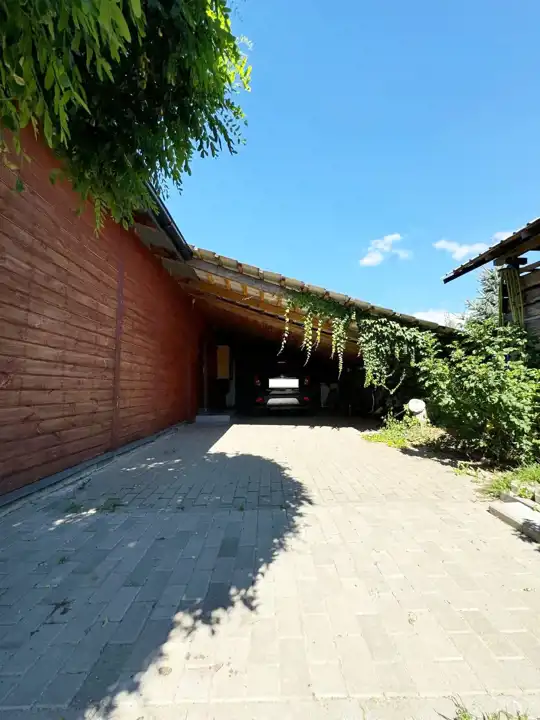 Duży, drewniany taras narożny+ wiata na samochód o powierzchni około 50 m2 wyłożona kostką brukową.
