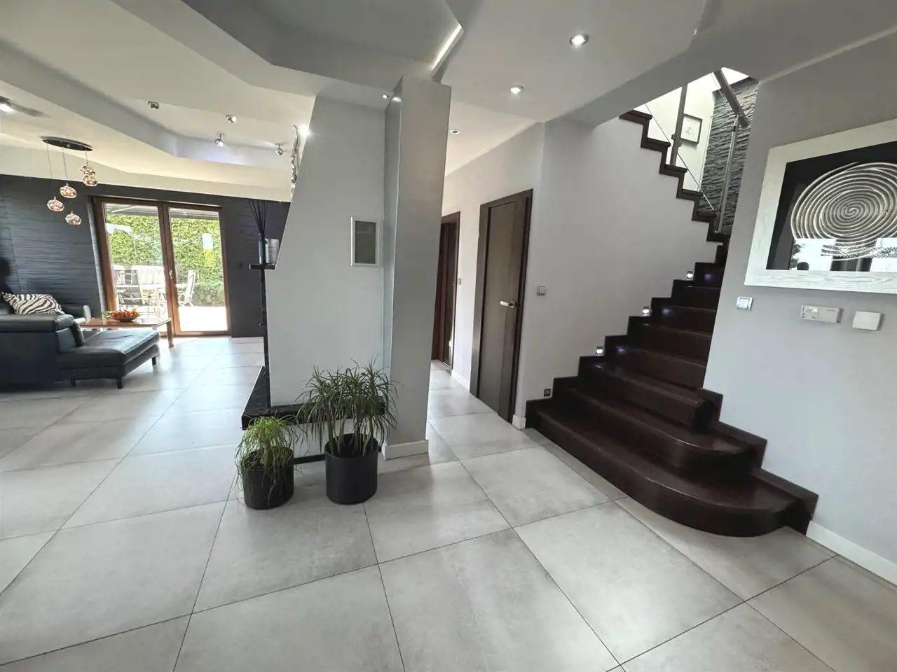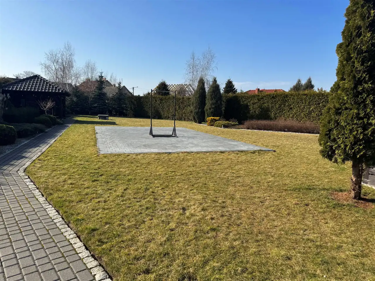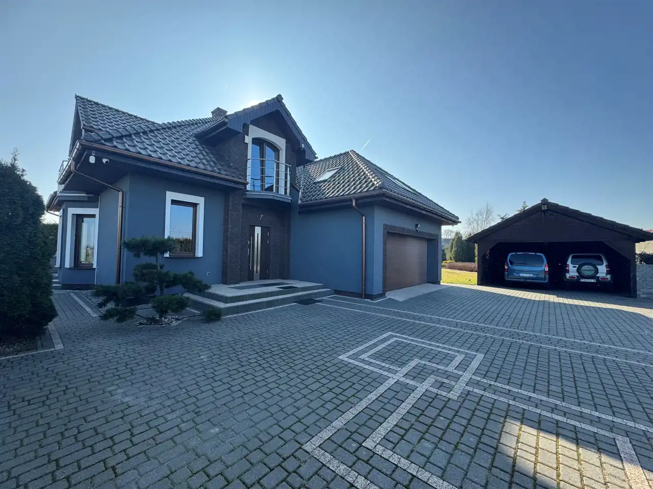 Na piętrze znajdują się trzy sypialnie ( jedna z garderobą 18,80 m.kw + 13,40 m.kw), 15,30 m.kw i 12,90m.kw, łazienki z wc o pow. 5,40 m.kw. Dom ogrodzony z automatyczną bramą wjazdową. Na działce znajduje się wiata dwustanowiskowa, altanka z urządzonym grillem, drewutnia i piękne nasadzenia. Automatyczne podlewanie ogrodu, oświetlenie zewnętrzne.