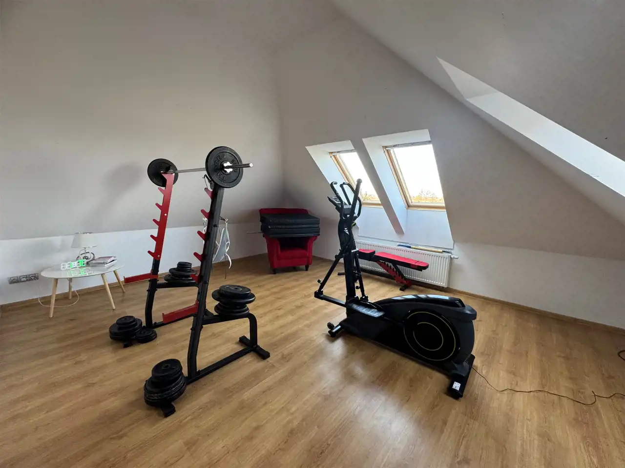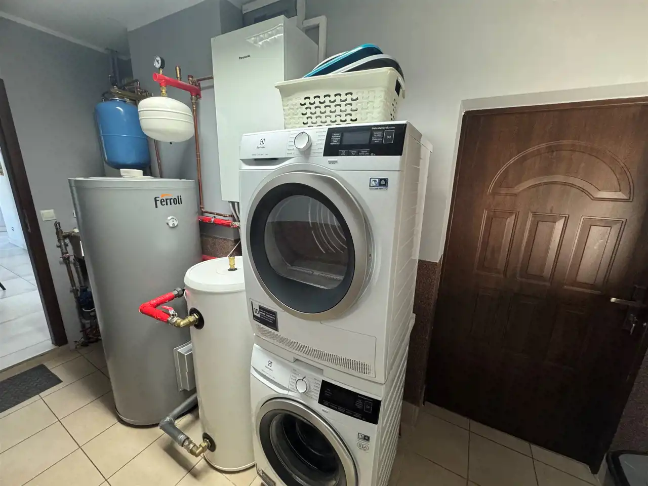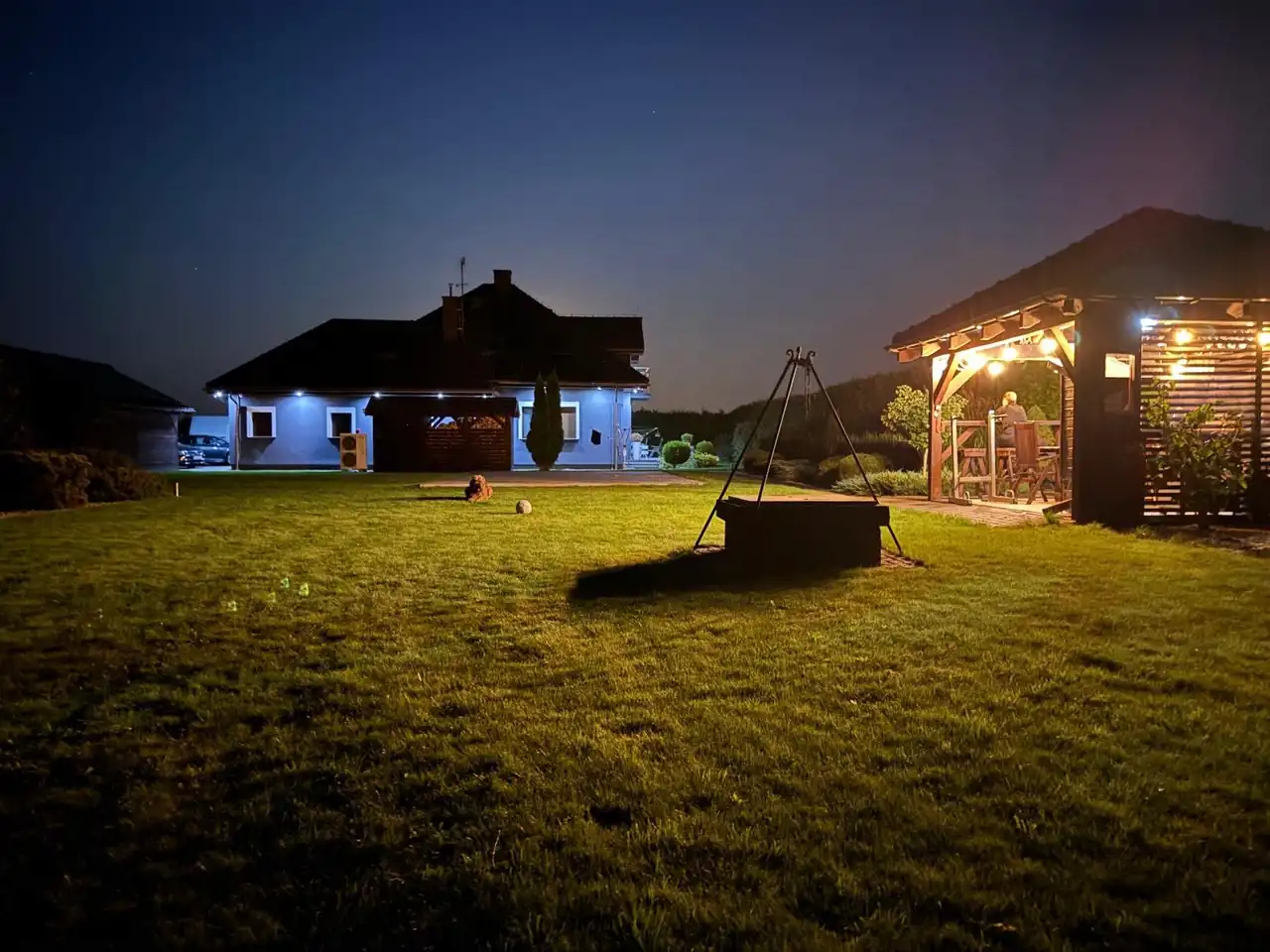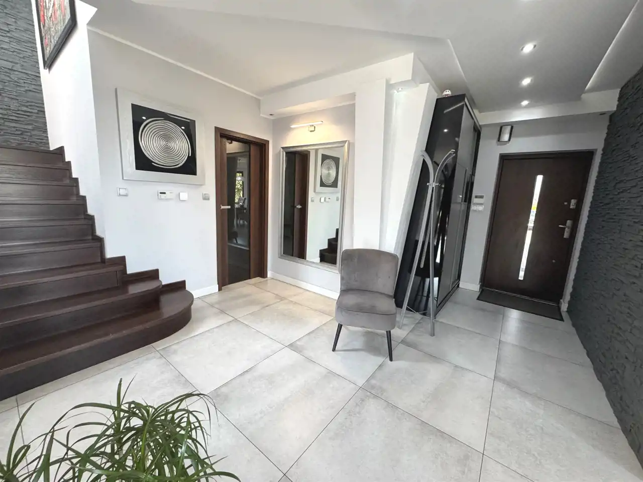 Na piętrze znajdują się trzy sypialnie ( jedna z garderobą 18,80 m.kw + 13,40 m.kw), 15,30 m.kw i 12,90m.kw, łazienki z wc o pow. 5,40 m.kw. Dom ogrodzony z automatyczną bramą wjazdową. Na działce znajduje się wiata dwustanowiskowa, altanka z urządzonym grillem, drewutnia i piękne nasadzenia. Automatyczne podlewanie ogrodu, oświetlenie zewnętrzne.