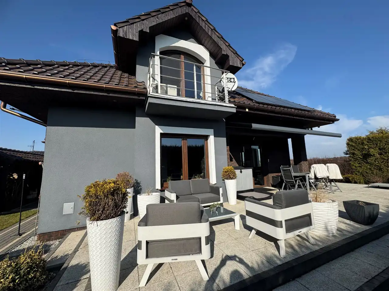 BESTATE nieruchomości Wrocław oferuje do sprzedaży dom wolnostojący o powierzchni użytkowej 196,60 m.kw (w tym garaż 32,80 m.kw) położony na działce o pow. 2197 m.kw., usytuowany w okolicach Gniezna, w zaciszu zieleni w parku krajobrazowym z widokiem na jezioro Lednica. Dom parterowy z poddaszem użytkowym, wybudowany w 2012r. z bloczków porotherm, dach pokryty dachówką ceramiczną, wykończony materiałami wysokiej jakości. Okna drewniane, taras o powierzchni 52 m.kw. Ogrzewanie podłogowe - pompa ciepła, (grzejniki w pokojach) oraz kominek z płaszczem wodnym. Dodatkowo fotowoltaika 10 kw, dzięki czemu dom jest bardzo ekonomiczny w utrzymaniu. Nieruchomość w pełni umeblowana, gustownie wykończona, wyposażenie w cenie zakupu.