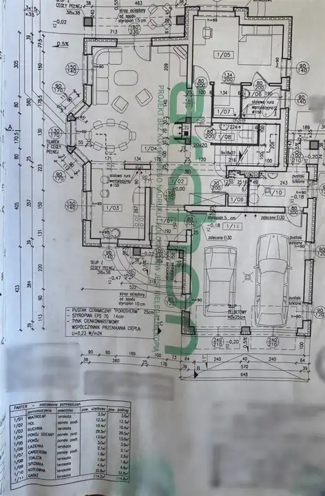 Nieruchomość składa się z salonu połączonego z otwartą kuchnią o powierzchni 52 m.kw, biura 10,40 m.kw, łazienki z wc o pow. 3m.kw, kotłowni o pow 4,90 m.kw, garażu 32,80 m.kw, garderoby, holu i wiatrołapu.
