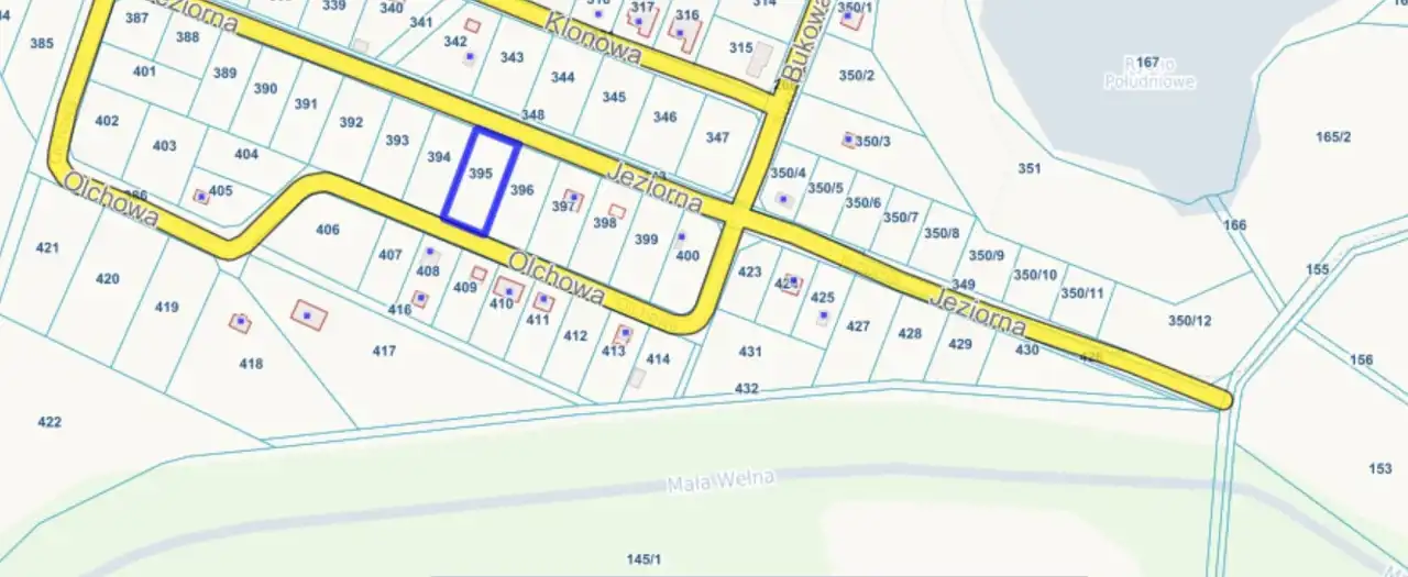 Działka pod zabudowę letniskową całoroczną murowaną malowniczo zlokalizowana na osiedlu domów letniskowych całorocznych w pobliżu plaży nad jez. Rybno Południowe w dolinie Małej Wełny. Na działce prąd a w drodze dojazdowej wodociąg. Kanalizacja w planach Gminy.