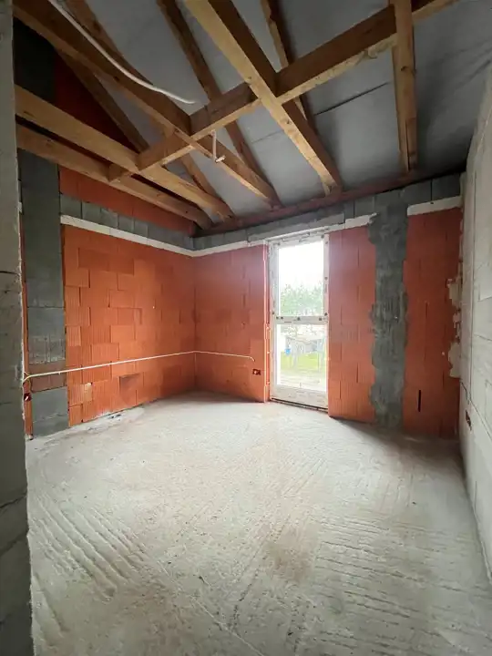 wybudowany z cegły ceramicznej porotherm; dach blachodachówka z podbitką i orynnowaniem; okna PCV (pakiet trzyszybowy), elewacja z dociepleniem zewnętrznym styropianem 20 cm; drzwi wejściowe: metalowe ocieplone; brama garażowa segmentowa; podjazd, chodnik, taras oraz opaska wokół domu wyłożone kostką brukową. W środku stan deweloperski obejmuje: tynki gipsowe; wylewki betonowe; instalacje: elektryczna (bez osprzętu), alarmowa, internetowa, wodno-kanalizacyjna, Tv w salonie; ogrzewanie podłogowe - parter (bez garażu), całe piętro; sufity na piętrze i docieplenie dachu oraz źródło ciepła we własnym zakresie kupującego.