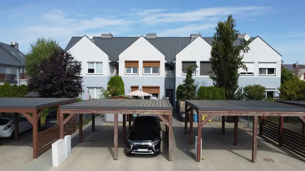 Przed domem stoi zadaszona, drewniana wiata na 2 auta, co jest dodatkowym plusem tej nieruchomości, rzadko spotykanym w analogicznych domach.
