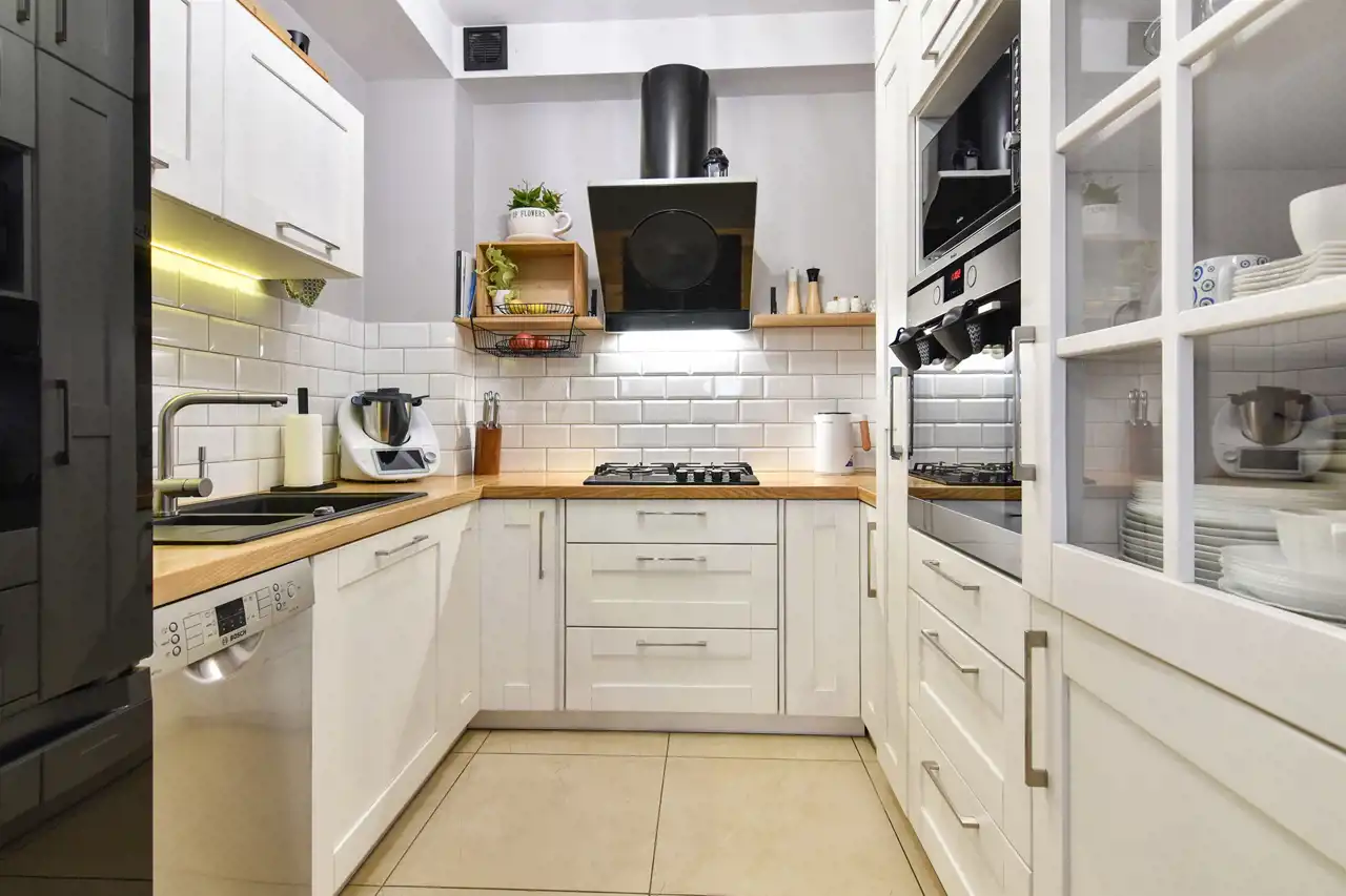 - położenie białych płytek na ścianach w korytarzu i salonie oraz kuchni (fartuch),