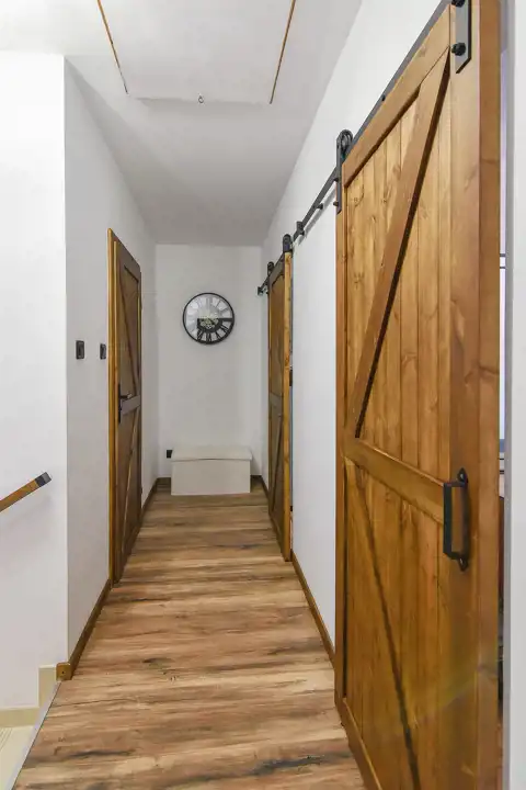 - wymiana wszystkich drzwi na drewniane z regulowanymi ościeżnicami, w tym montaż systemów przesuwnych w sypialni i pokoju dziecięcym,