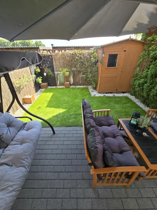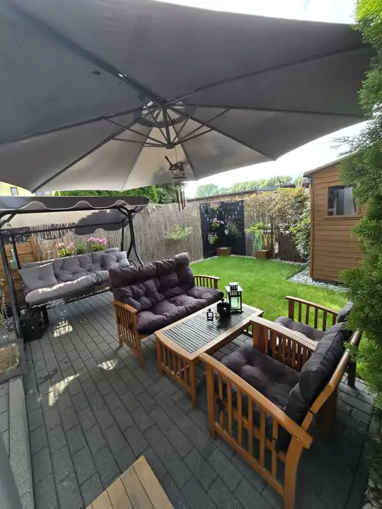 Główną część domu stanowi wygodny salon, zachęcający do spędzania w nim czasu, z którego przechodzimy do kameralnego ogródka z meblami ogrodowymi, parasolem i domkiem narzędziowym, pozwala na odpoczynek po długim dniu.