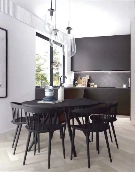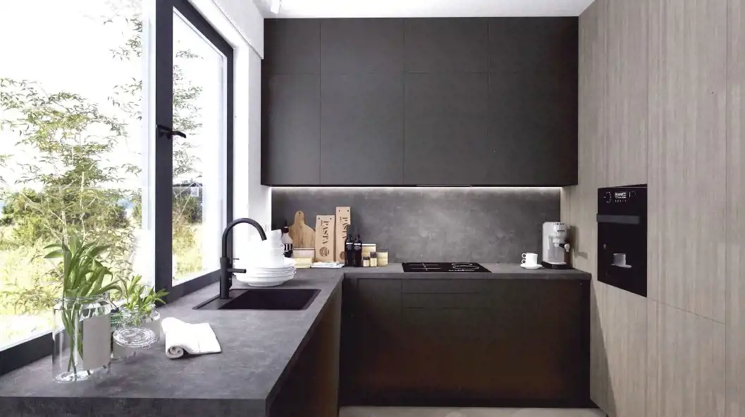 Sama kuchnia wyposażona w wysokiej klasy sprzęty, zabudowana ciemnymi, nowoczesnymi meblami jest wygodna i funkcjonalna.
