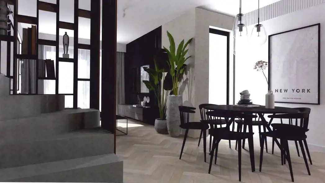 Dom pochodzi z rynku wtórnego. Został wykończony przez dewelopera prawie w pełni tak jak jest to przedstawione na załączonych wizualizacjach. Rzeczywiste zdjęcia pojawią się wkrótce.