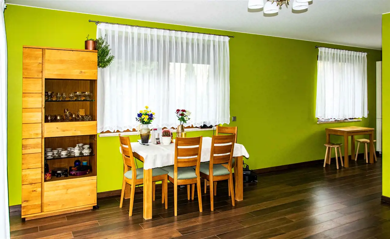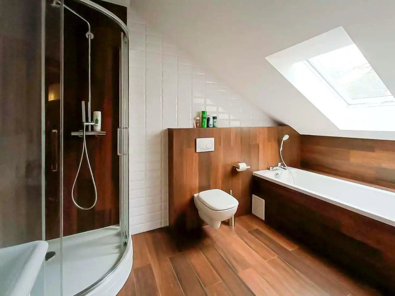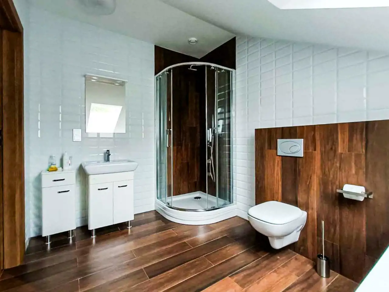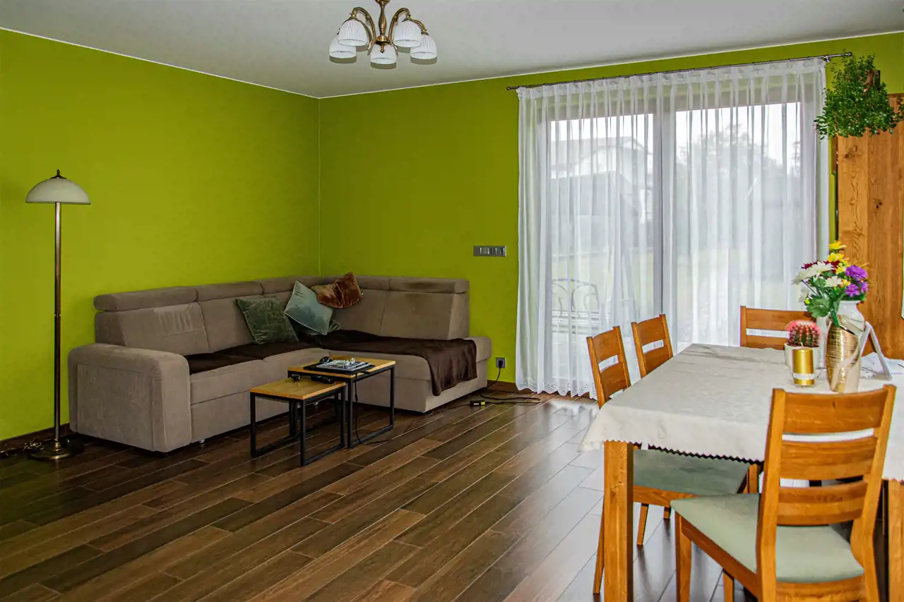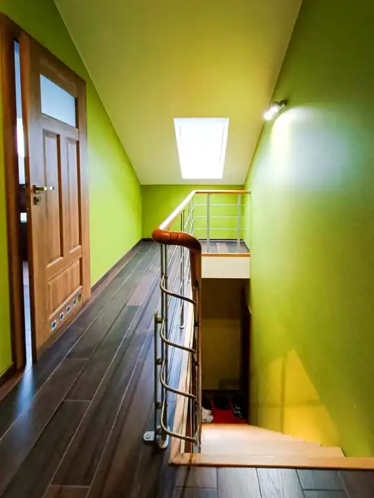 Na poddaszu znajdują się dwie sypialnie z garderobami oraz łazienka z WC. Na parterze znajdziemy kolejne dwie sypialnie, duży salon z wyjściem na tras oraz jadalnię połączoną z kuchnią. W domu jest miejsce na spiżarnie oraz wyjście do garażu. Niepodważalnym atutem nieruchomości jest domek gościnny z letnią kuchnią - to doskonałe miejsce na zabawę, relaks i grilla.