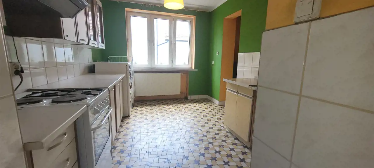 Dom z lat 80-tych, do remontu (10 x 10m, 2 kondygnacje - przyziemie h =2,2m + piętro 2,58m).