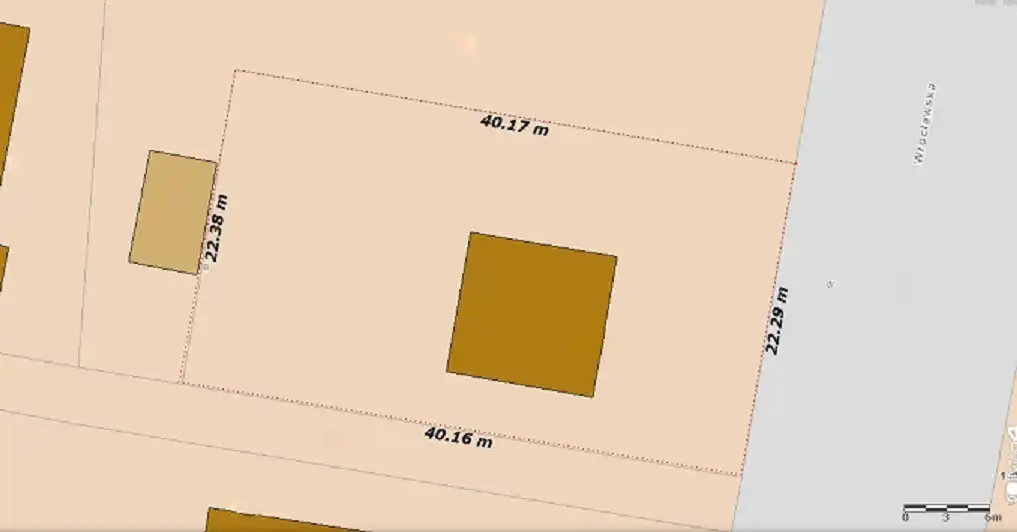 Wymiary 40 x 22m (front działki - 22m), linia zabudowy - tak jak istniejący budynek,