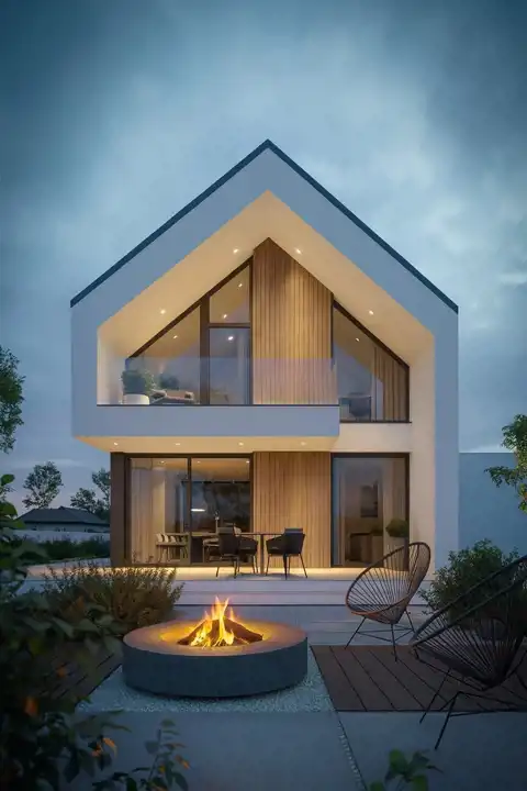 Architektura premium – prosta forma, akcenty z naturalnego drewna, elewacja z efektem „ramy” i imponujące przeszklenia na dwie kondygnacje.