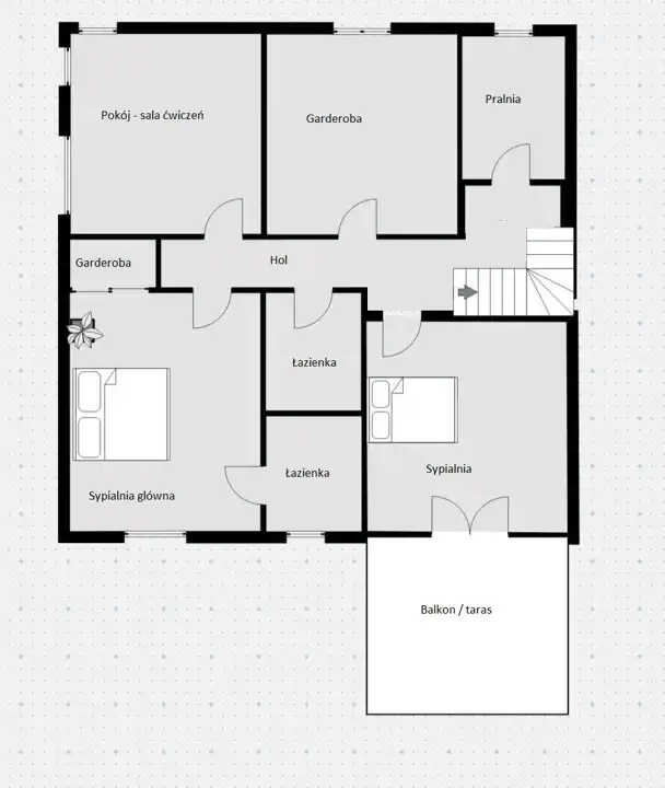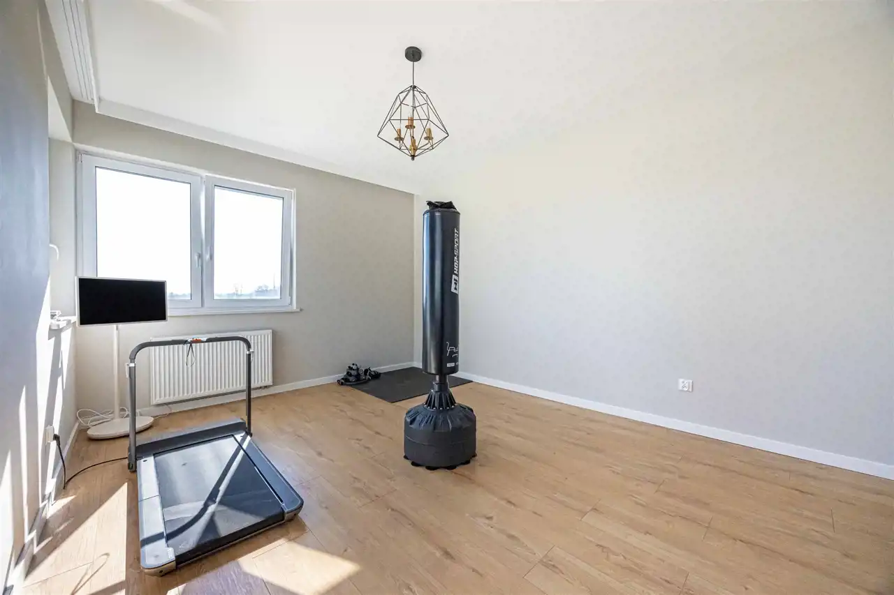 Na piętrze usytuowane są 2 przestronne sypialnie, w tym jedna z garderobą i łazienką, a druga z tarasem, osobna garderoba, łazienka z prysznicem, pokój – sala ćwiczeń oraz pomieszczenie gospodarcze wykorzystywane obecnie jako pralnia.