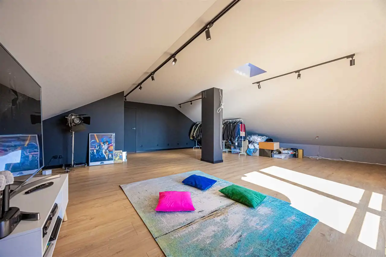 Na poddaszu z klimatyzacją (powierzchnia użytkowa ok. 90 m2, po podłodze 130 m2) znajduje się dodatkowa sypialnia z łazienką i duża, otwarta przestrzeń do zagospodarowania, zgodnie z projektem, pod bar i salę rozrywkową.