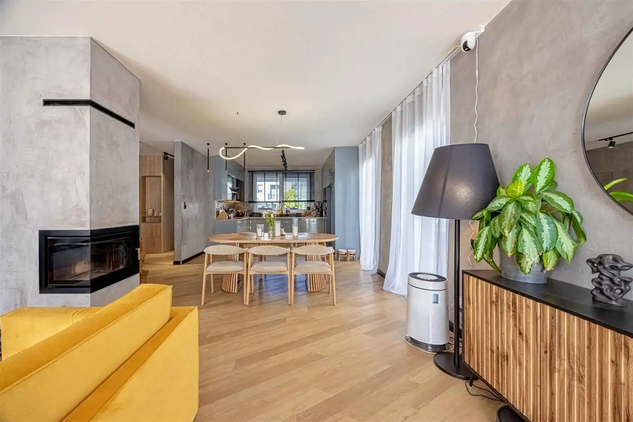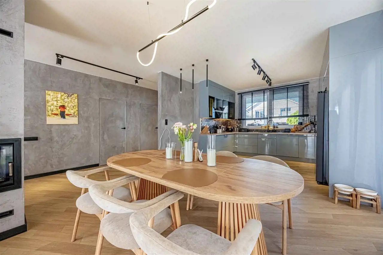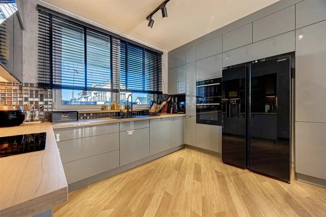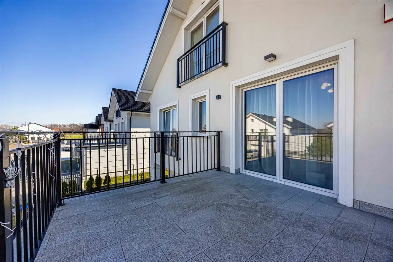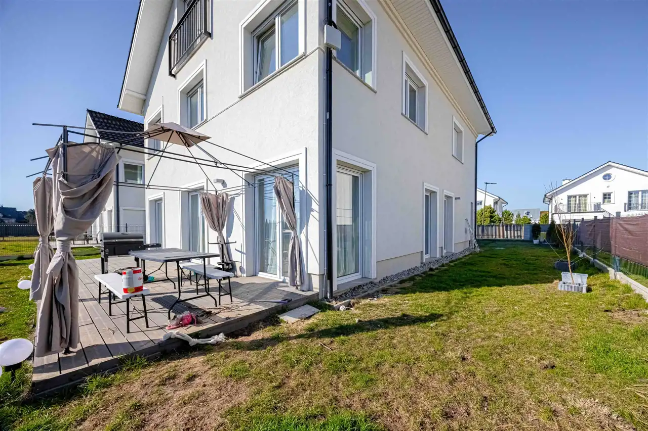 położony na działce 661 m2, gustowanie umeblowany, wykończony z najwyższej klasy trwałych materiałów. Aainstalowane ogrzewanie podłogowe na parterze i piętrze, elektrycznie sterowane rolety zewnętrzne.