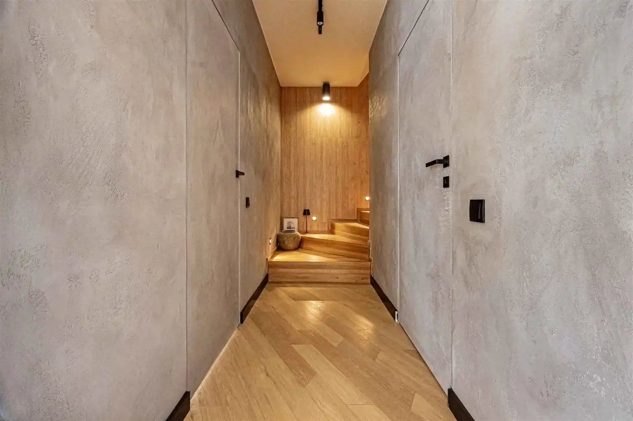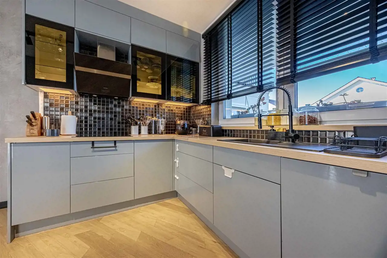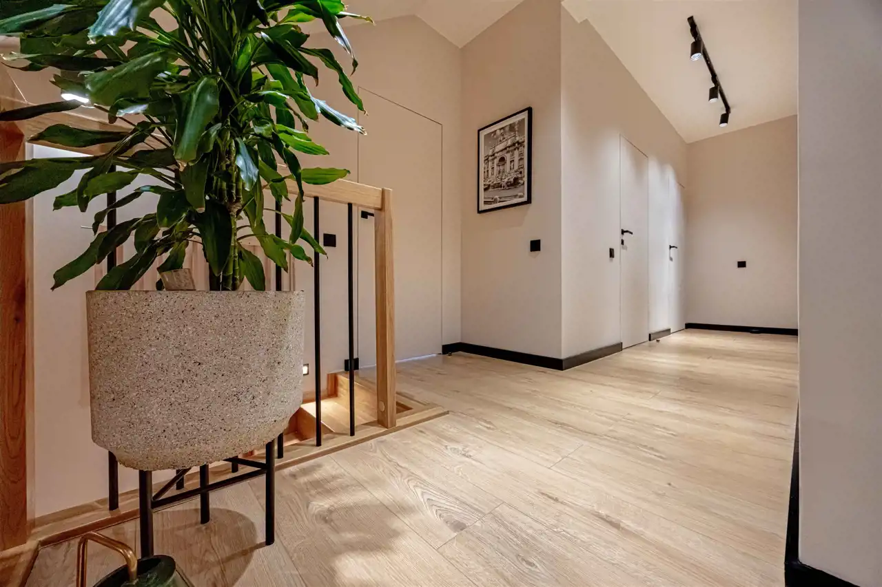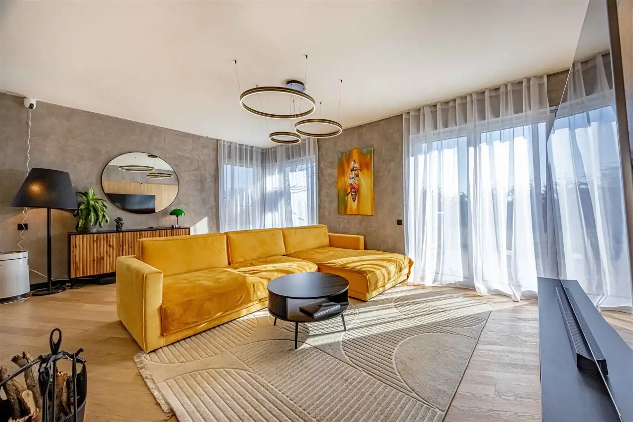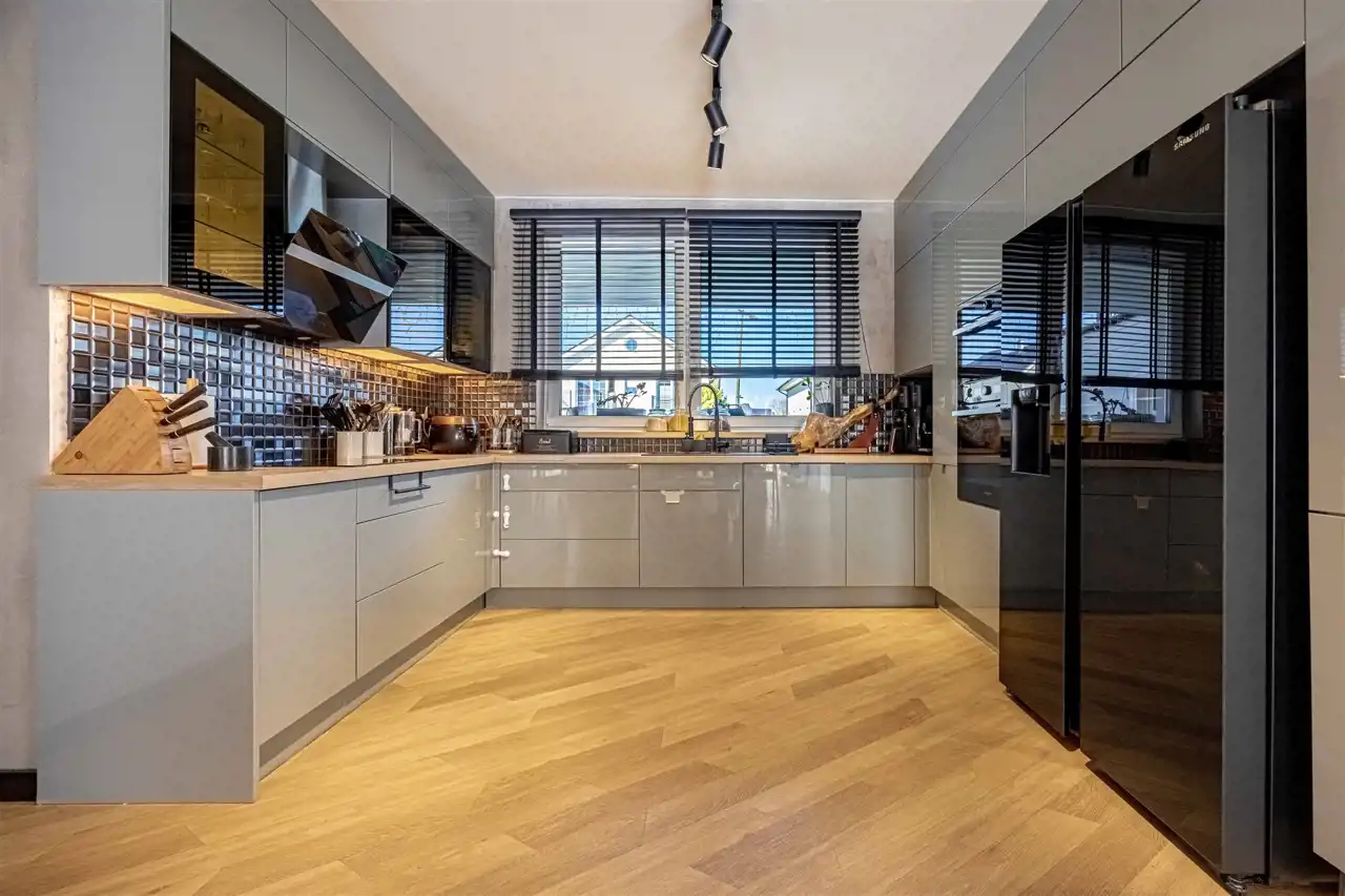położony na działce 661 m2, gustowanie umeblowany, wykończony z najwyższej klasy trwałych materiałów. Aainstalowane ogrzewanie podłogowe na parterze i piętrze, elektrycznie sterowane rolety zewnętrzne.