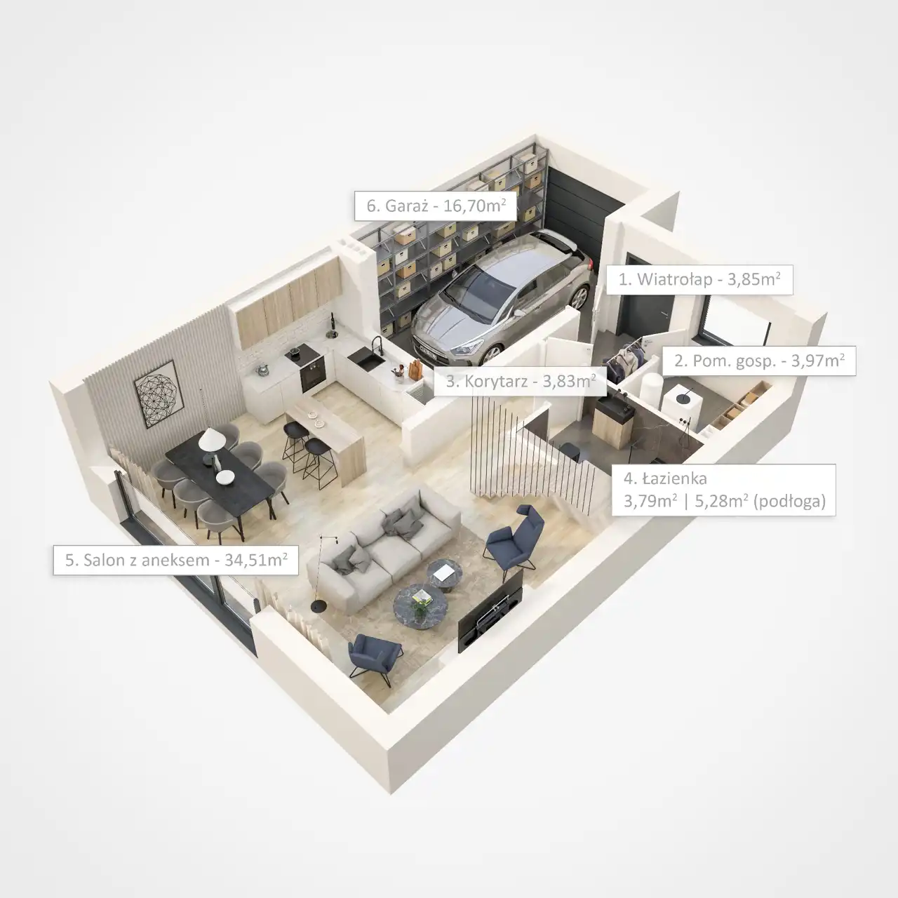 Reprezentacyjną część domu stanowi obszerny salon 32m2 z aneksem kuchennym 7,7m2. Salon posiada duże panoramiczne okno od strony ogrodu z wyjściem na taras. duży garaż ze sterowaną na pilota automatyczną bramą segmentową połączony z pomieszczeniem gospodarczym, oraz łazienka z wc.